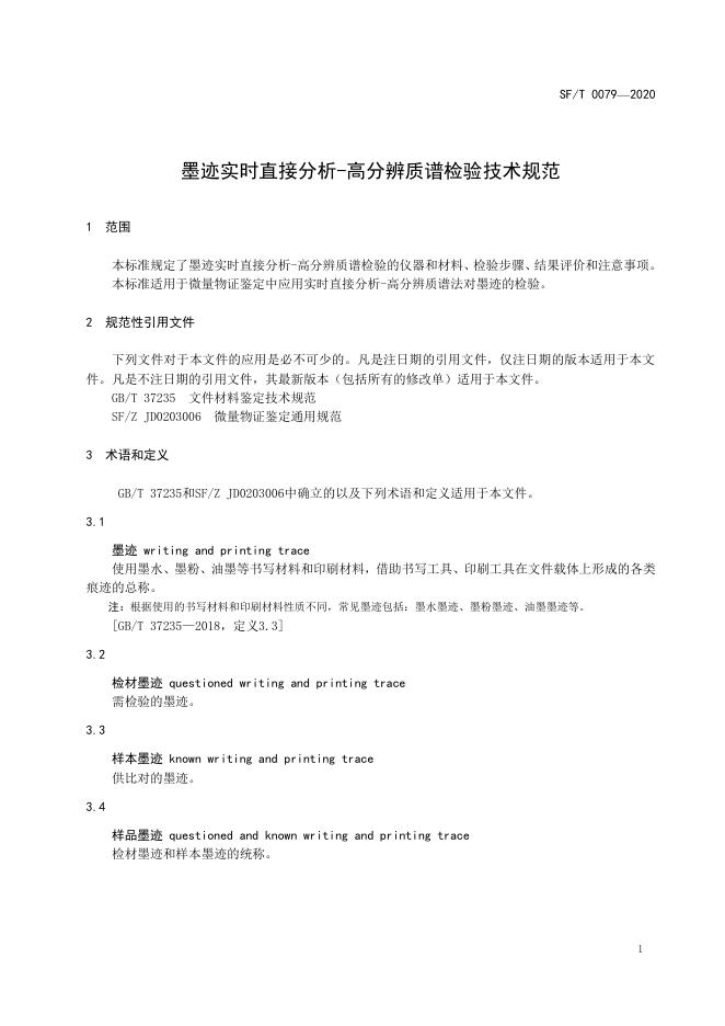 SF/T 0079-2020 墨迹实时直接分析-高分辨质谱检验技术规范