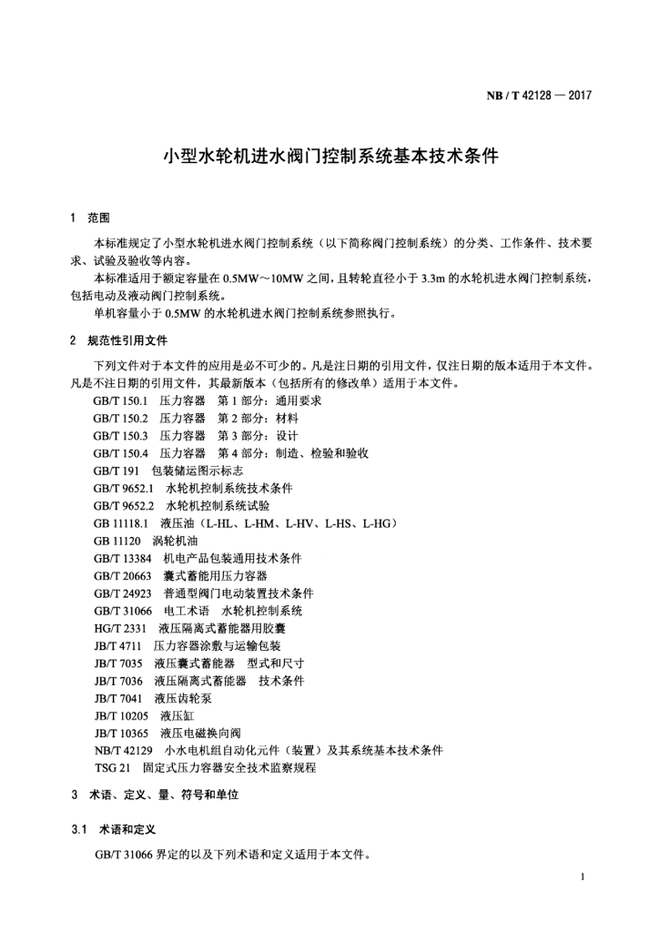 NB/T 42128-2017 小型水轮机进水阀门门控制系统基本技术条件