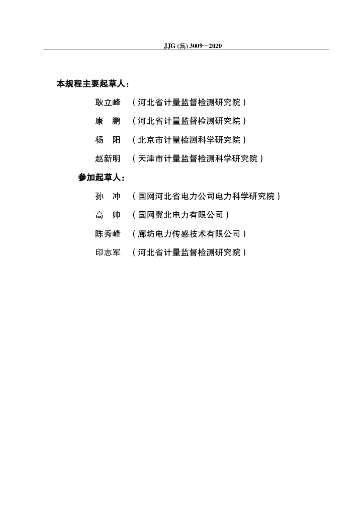 耿立峰(河北省计量监督检测研究院)、康鹏(河北省计量监督检测研究院)、杨阳(北京市计量检测科学研究院)、赵新明(天津市计量监督检测科学研究院)、孙冲(国网河北省电力公司电力科学研究院)、高帅(国网冀北电力有限公司)、陈秀峰(廊坊电力传感技术有限公司)、印志军(河北省计量监督检测研究院)