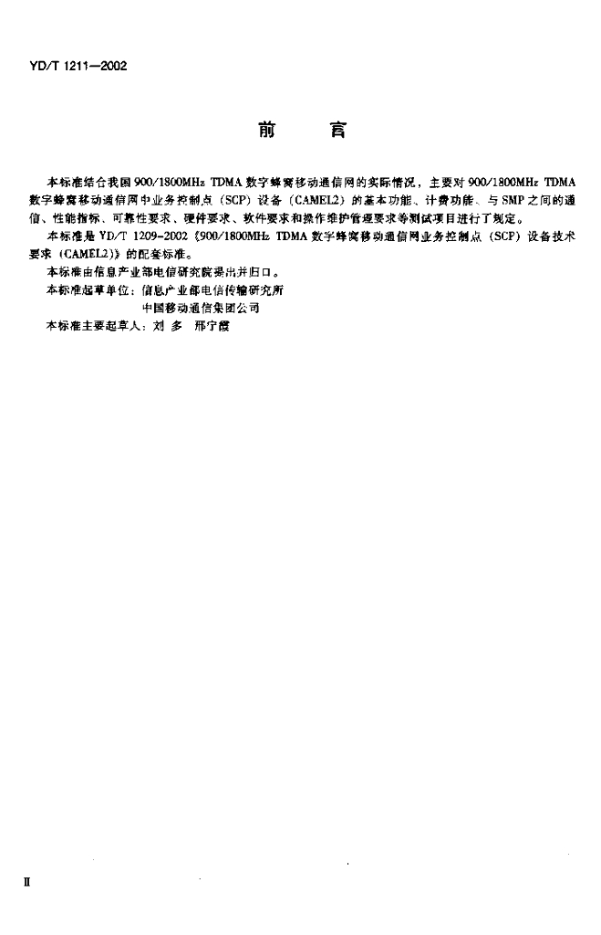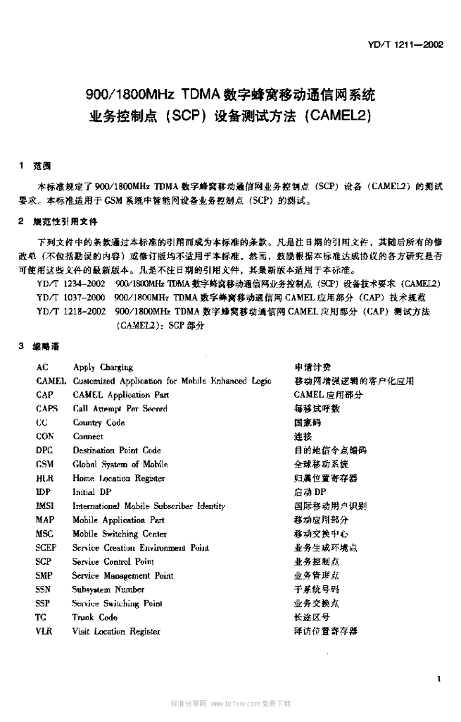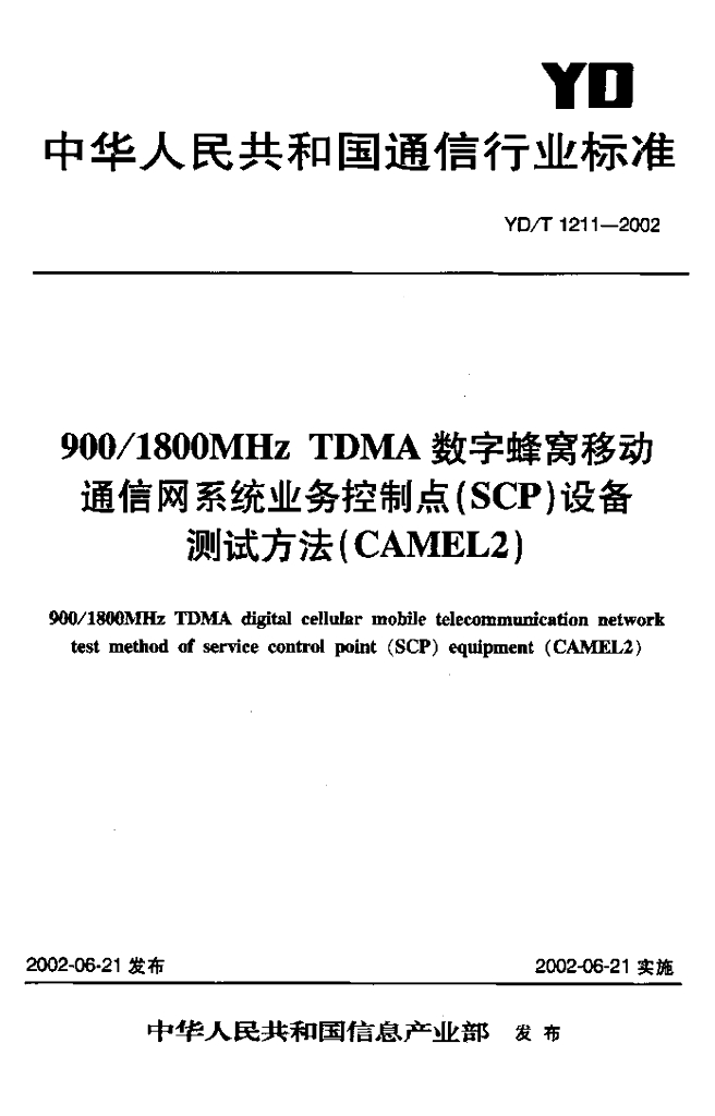 YD/T 1211-2002 900/1800MHz TDMA 数字蜂窝移动通信网系统业务控制点(SCP)设备测试方法(CAMEL2)