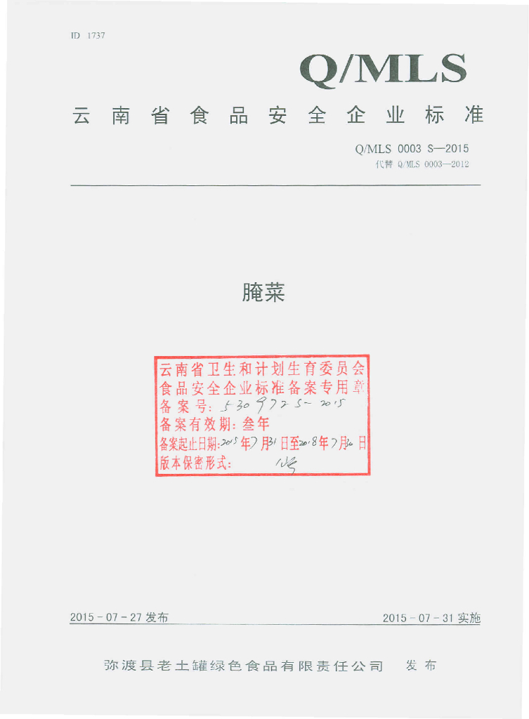 Q/MLS 0003S-2015 弥渡县老土罐绿色食品有限责任公司 腌菜