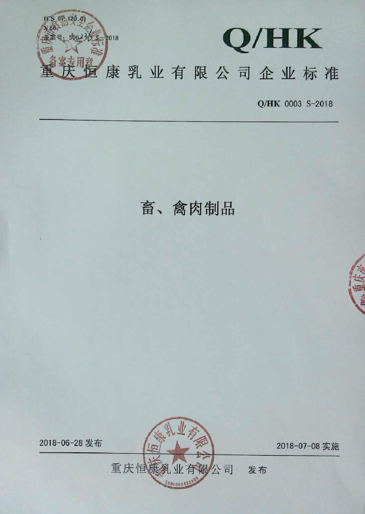 Q/HK 0003S-2018 畜、禽肉制品