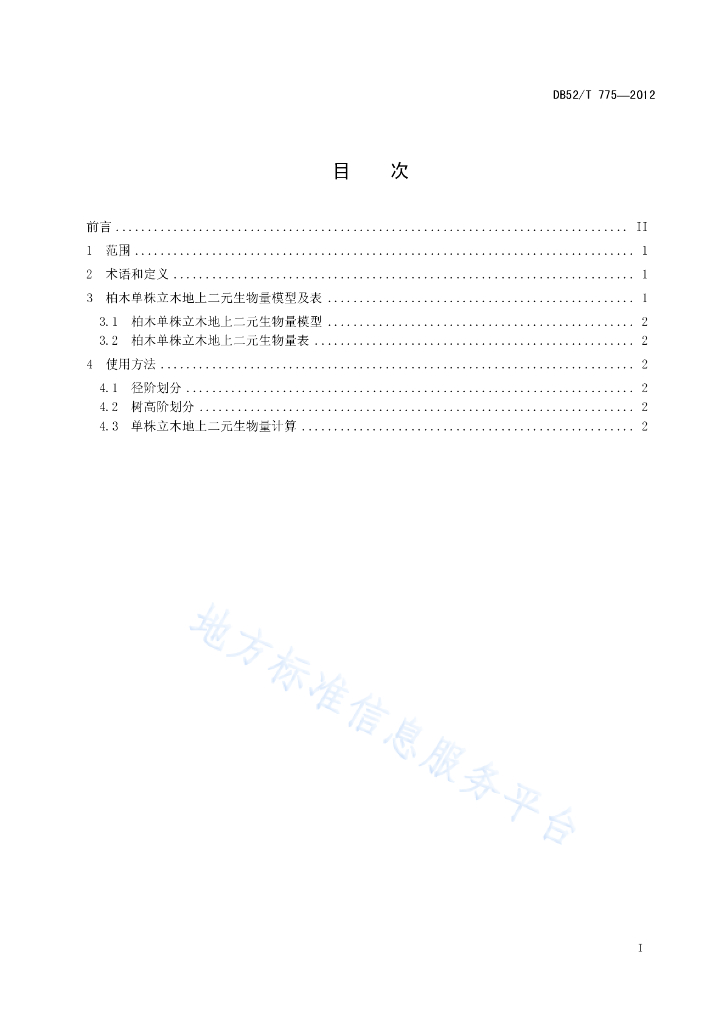 DB52/T 775-2012 柏木单株立木地上二元生物量表