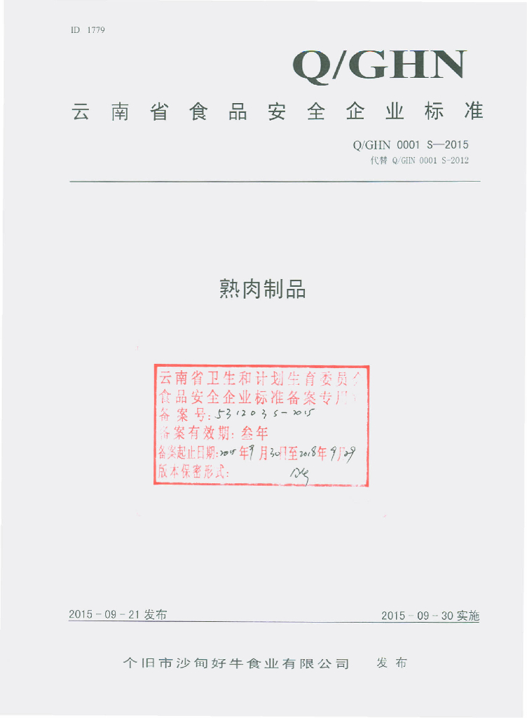 Q/GHN 0001S-2015 个旧市沙甸好牛食业有限公司 熟肉制品