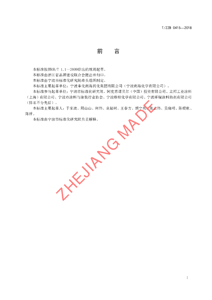 宁波奉化南海药化集团有限公司(宁波南海化学有限公司)、宁波市标准化研究院、阿克苏诺贝尔(中国)投资有限公司、立邦工业涂料(上海)有限公司、宁波市涂料与涂装行业协会、宁波维楷化学有限公司、宁波祥瑞涂料助剂有限公司