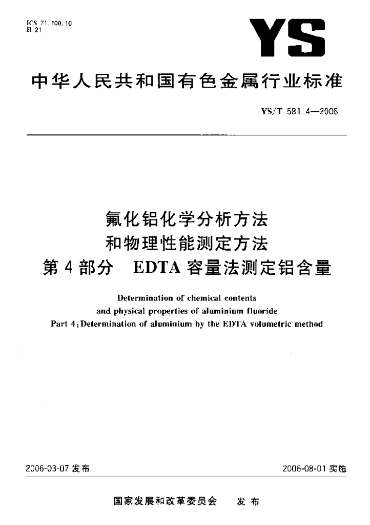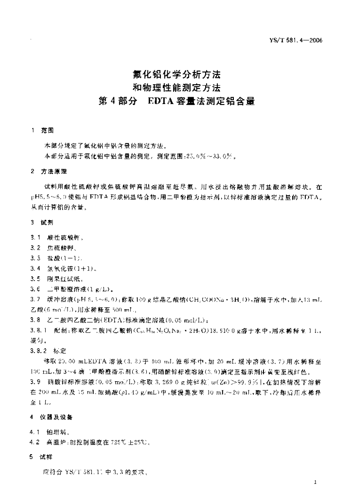 YS/T 581.4-2006 氟化铝化学分析方法和物理性能测定方法 第4部分:EDTA容量法测定铝含量