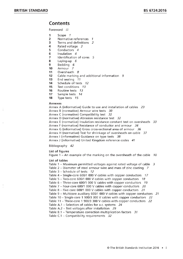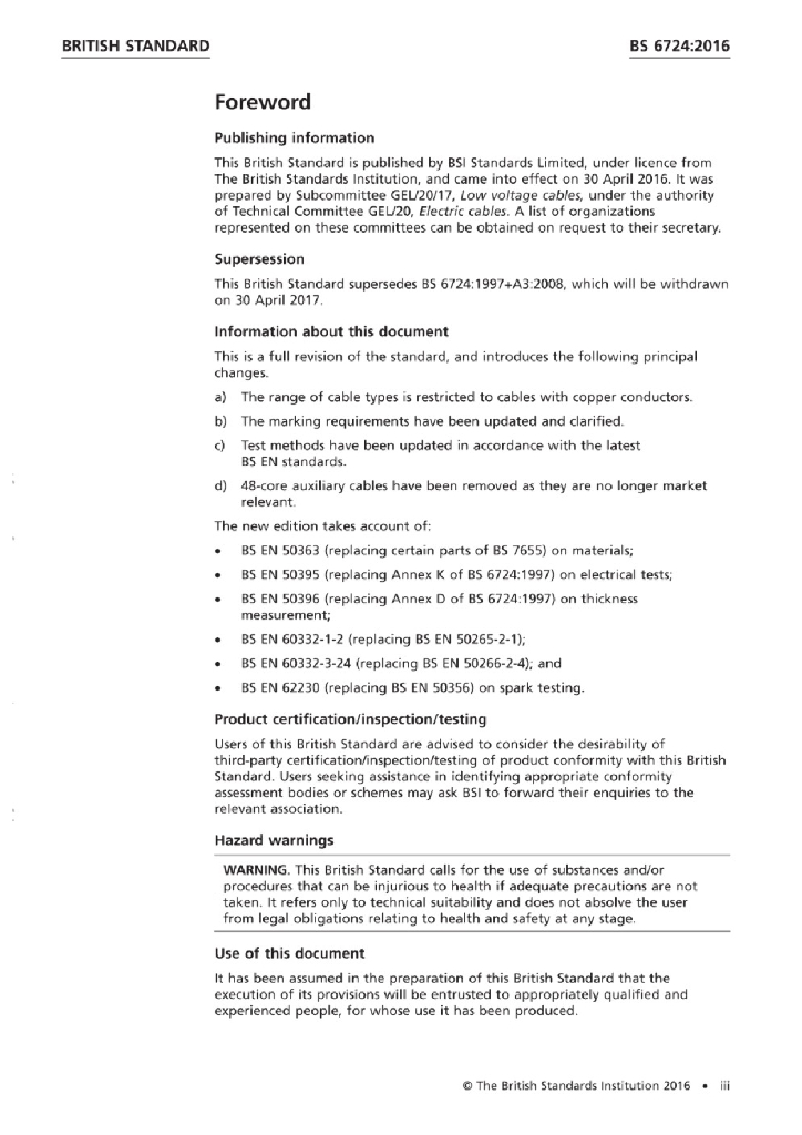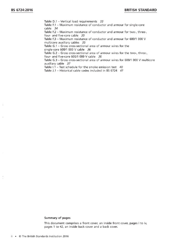 - 2BS 6724:2016 固定敷设用、受火侵袭时烟雾和腐蚀性气体排放量低的额定电压600 1000V和1900 3300V热固性绝缘铠装电缆