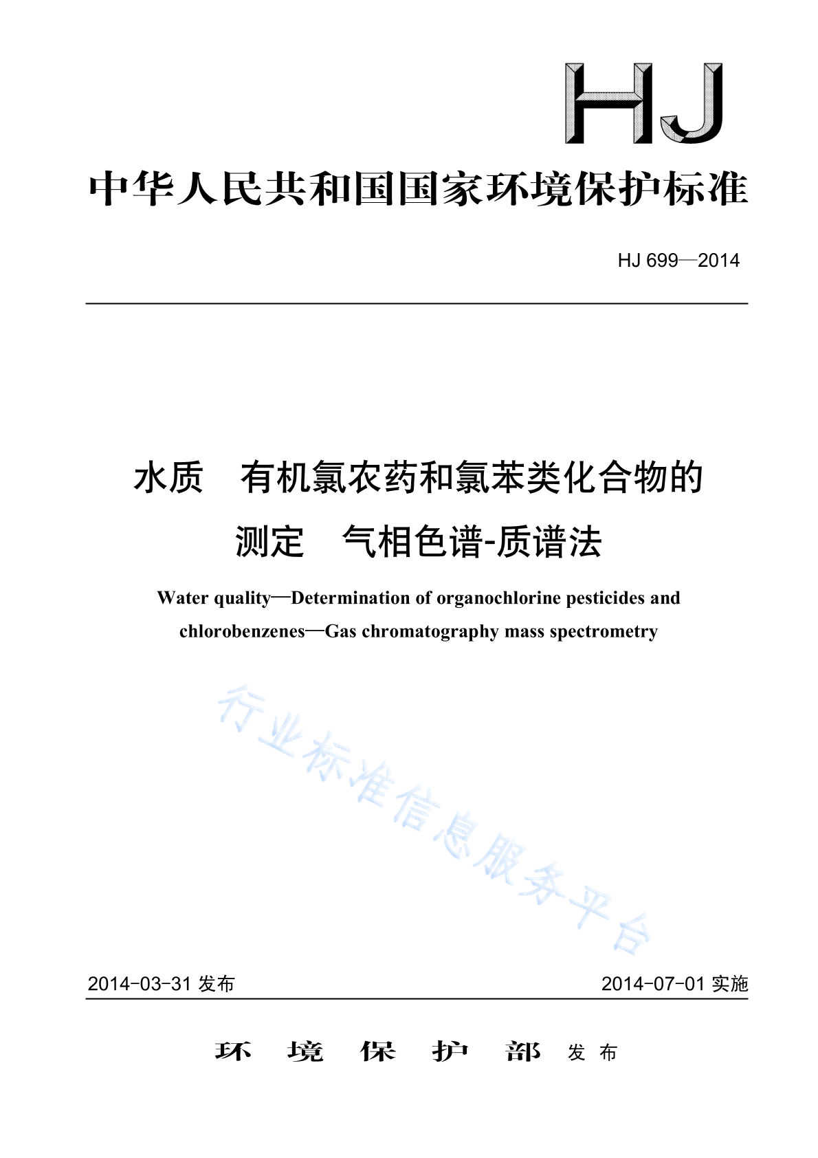 HJ 699-2014 水质 有机氯农药和氯苯类化合物的测定 气相色谱-质谱法