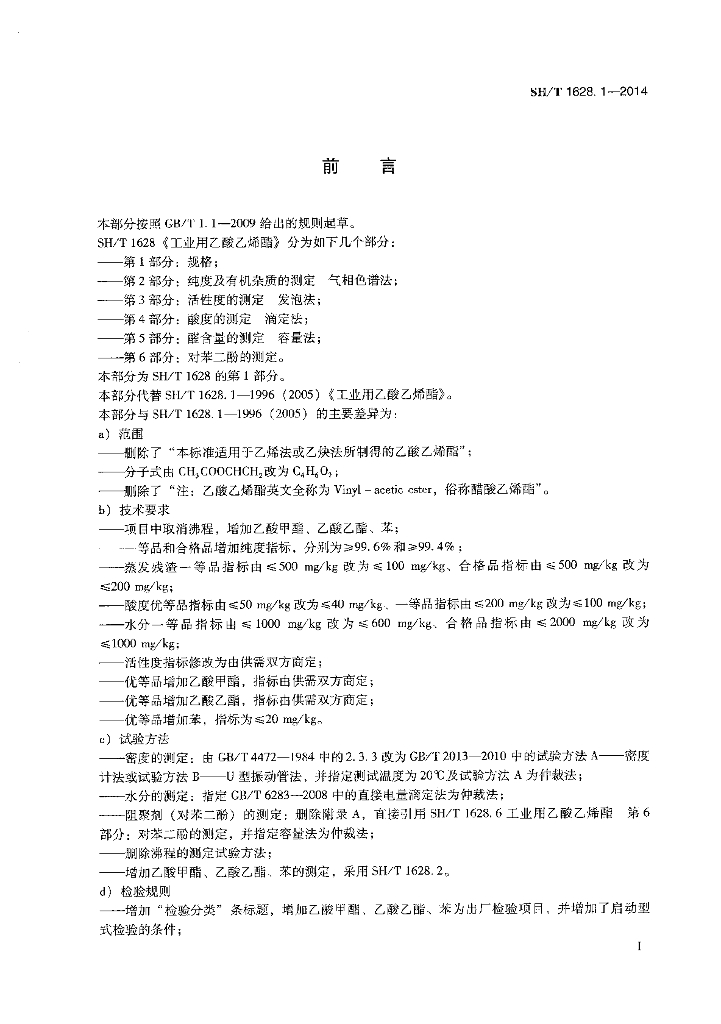 SH/T 1628.1-2014 工业用乙酸乙烯酯 第1部分:规格