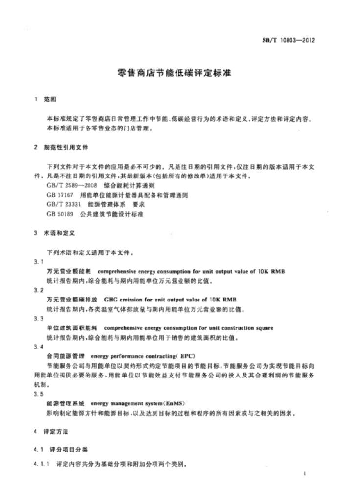 SB/T 10803-2012 零售商店节能低碳评定标准