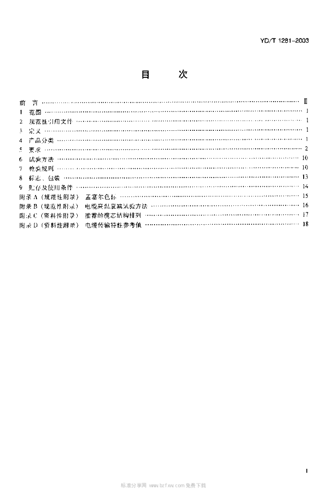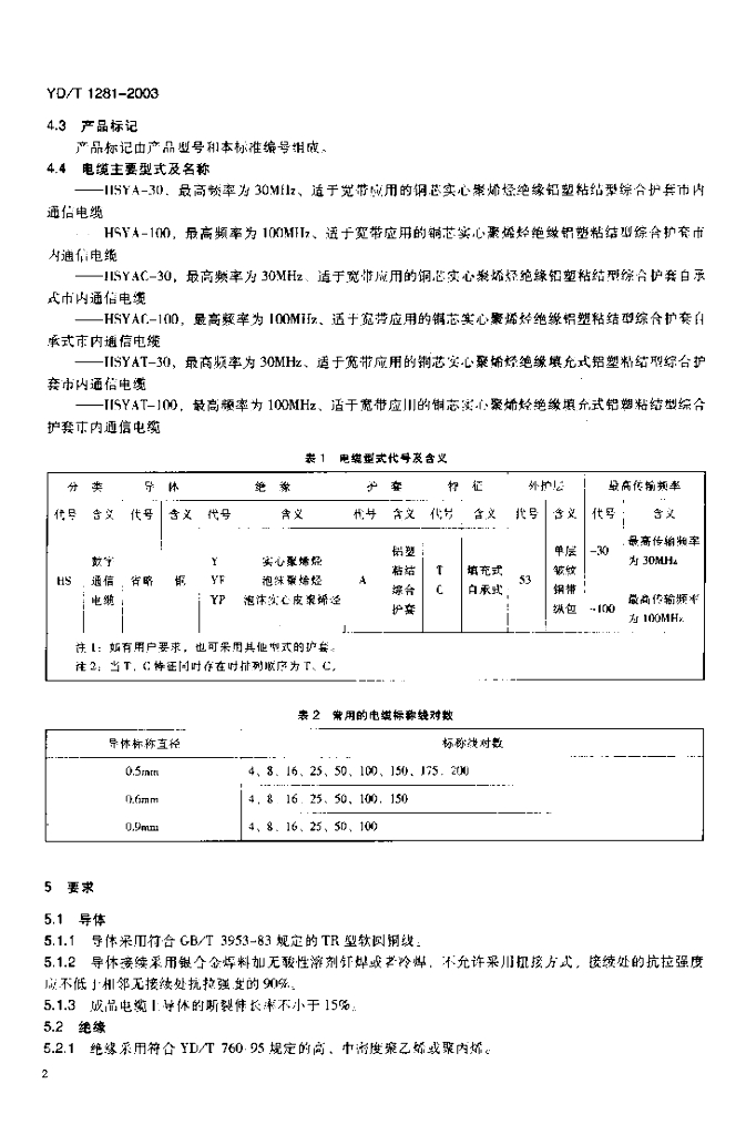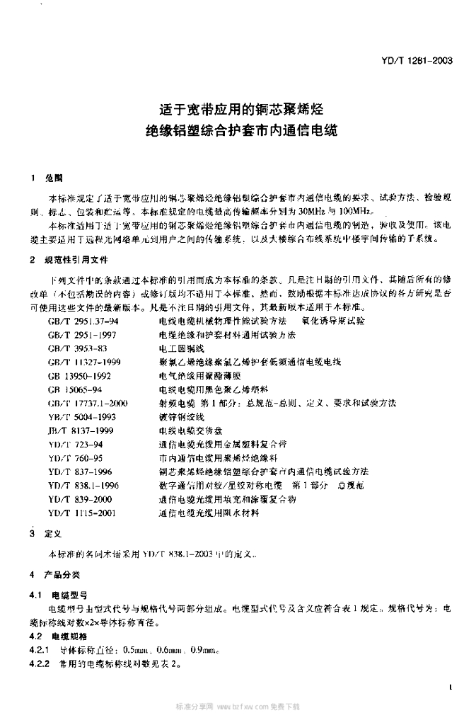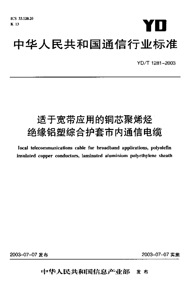 YD/T 1281-2003 适于宽带应用的铜芯聚烯烃绝缘铝塑综合护套市内通信电缆