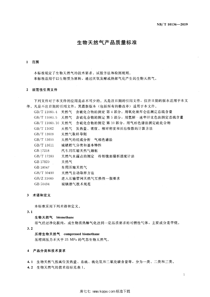 NB/T 10136-2019 生物天然气产品质量标准
