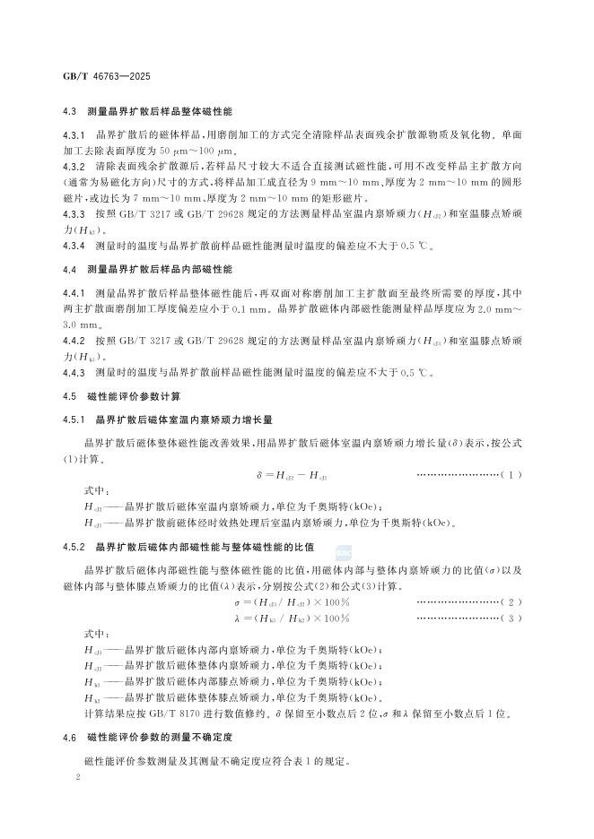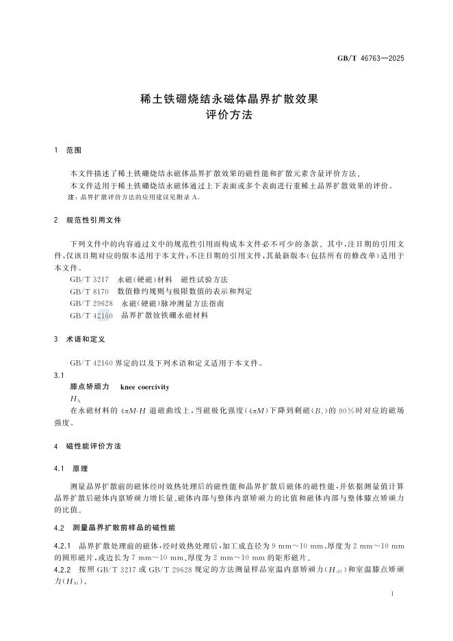 GB/T 46763-2025 稀土铁硼烧结永磁体晶界扩散效果评价方法