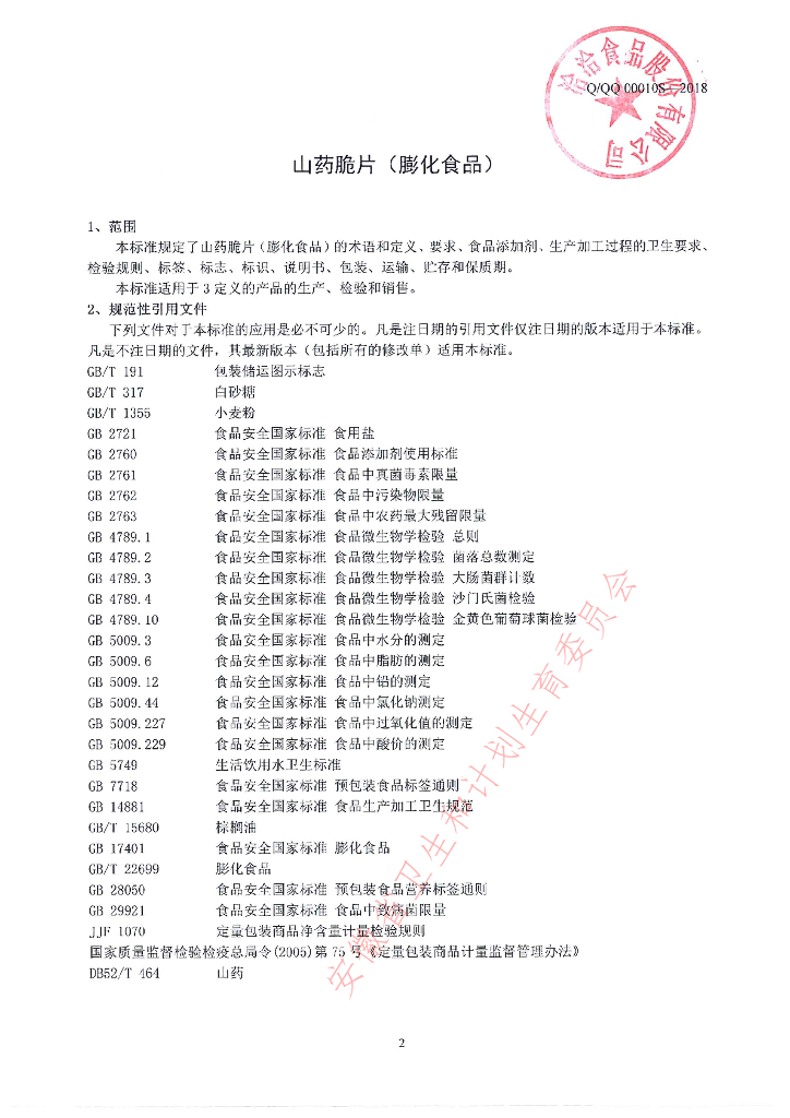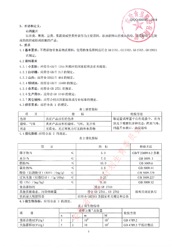 Q/QQ 00010S-2018 山药脆片(膨化食品)