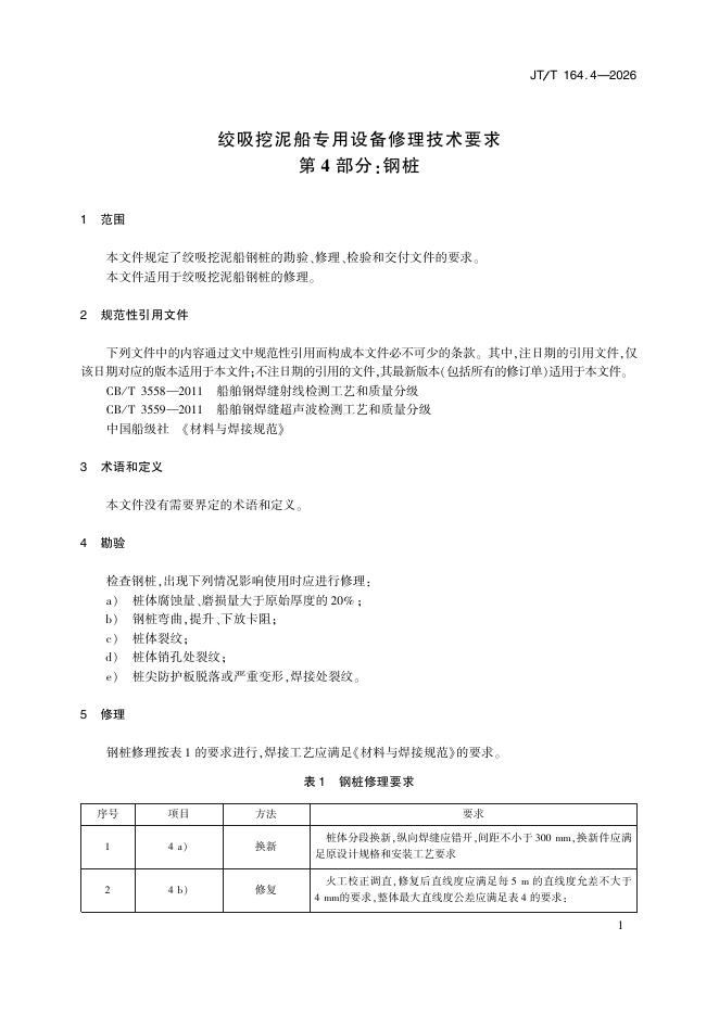 JT/T 164.4-2026 绞吸挖泥船专用设备修理技术要求 第4部分:钢桩