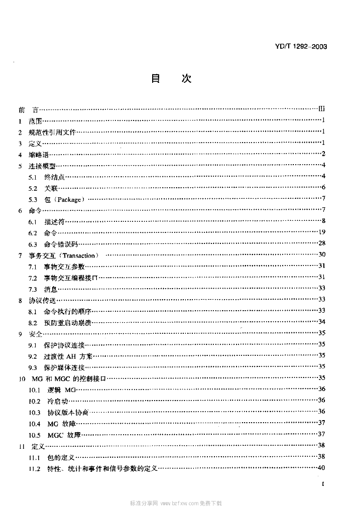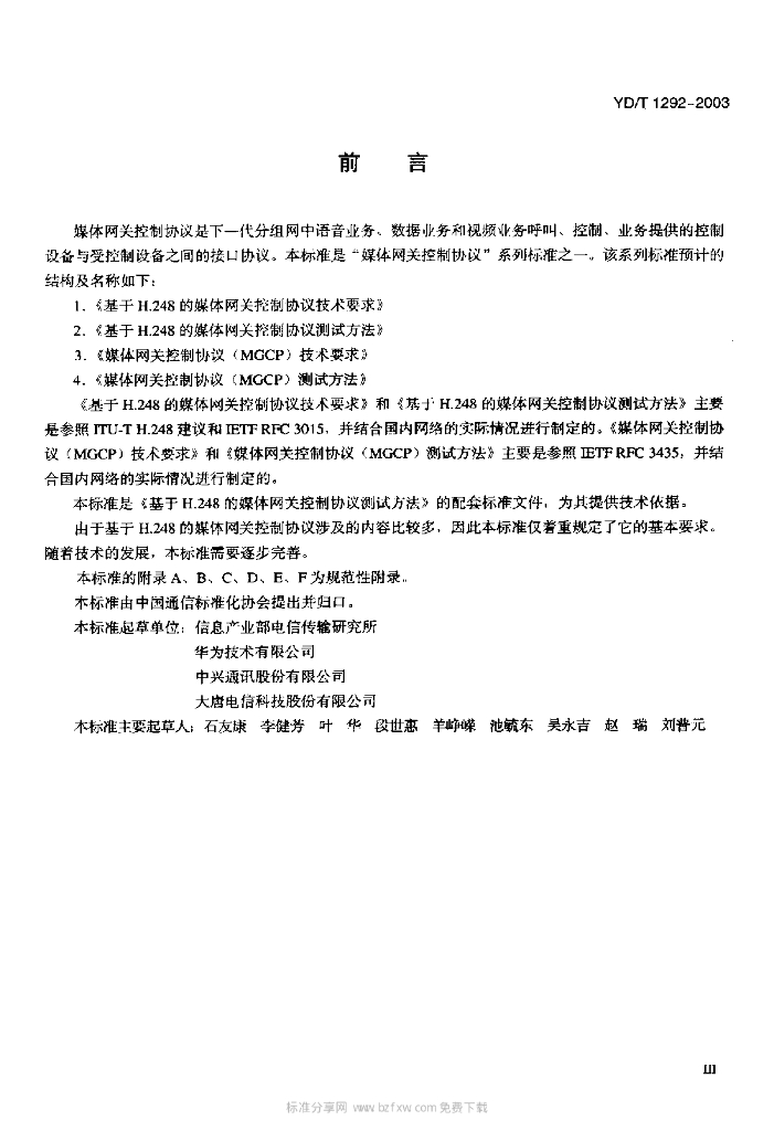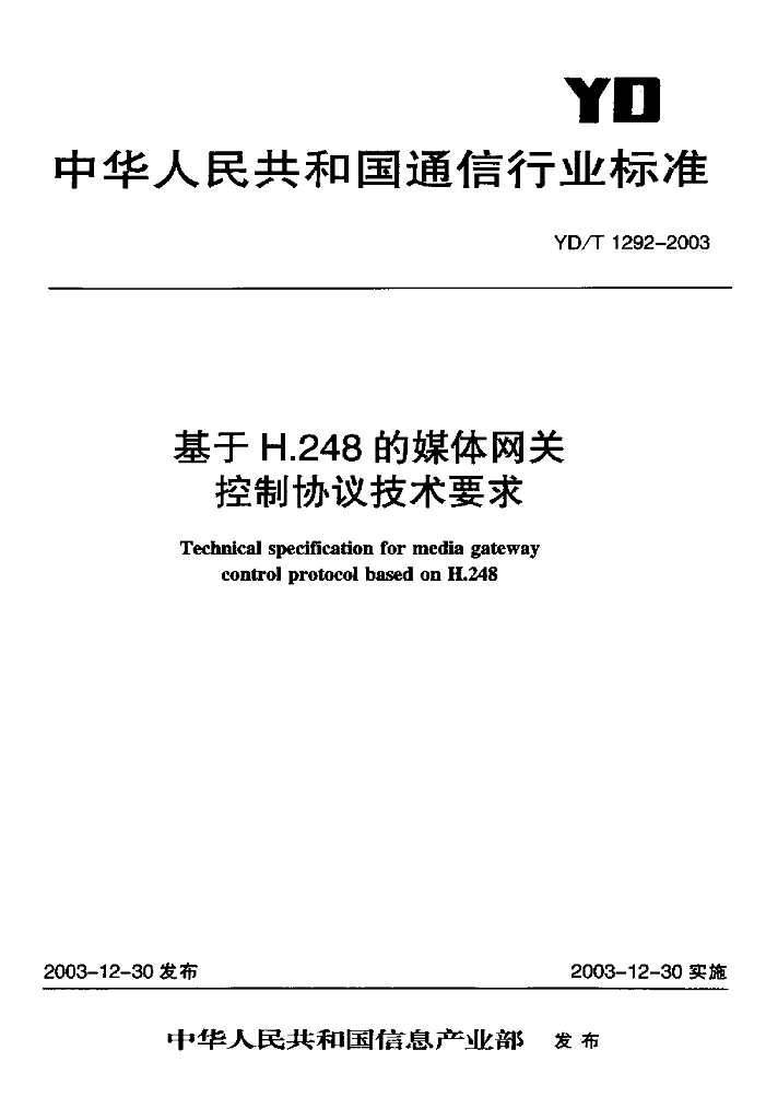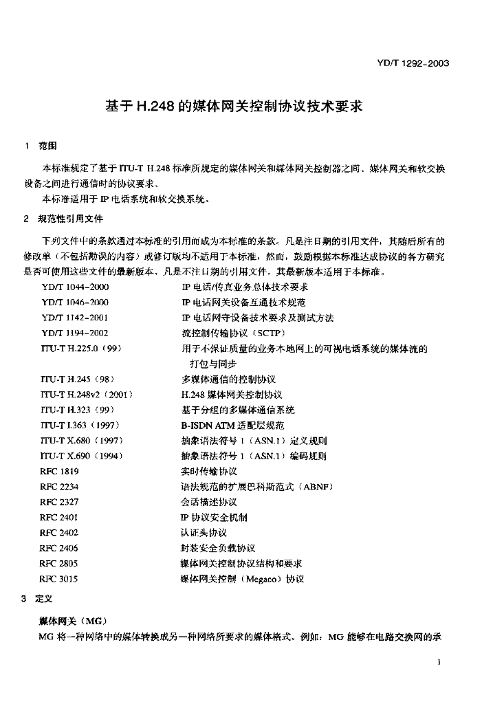 YD/T 1292-2003 基于 H.248 的媒体网关控制协议技术要求