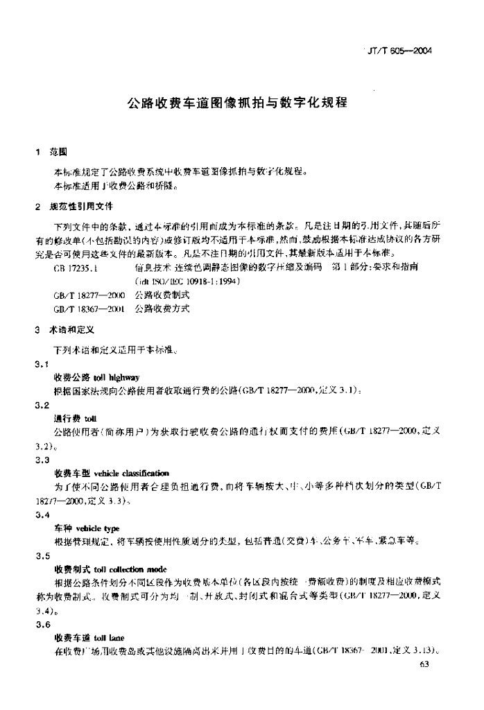 JT/T 605-2004 公路收费车道图像抓拍与数字化规程