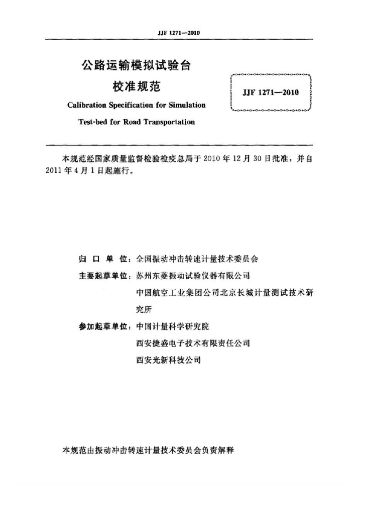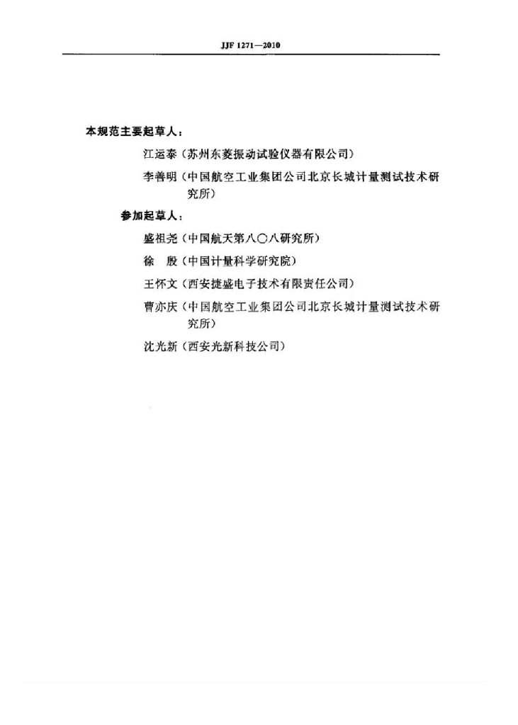 江运泰(苏州东菱振动试验仪器有限公司)、李善明(中国航空工业集团公司北京长城计量测试技术研究所)、盛祖尧(中国航天第八O八研究所)、徐殷(中国计量科学研究院)、王怀文(西安捷盛电子技术有限责任公司)、曹亦庆(中国航空工业集团公司北京长城计量测试技术研究所)、沈光新(西安光新科技公司)