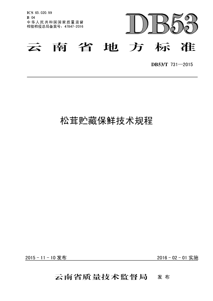 DB53/T 731-2015 松茸贮藏保鲜技术规程