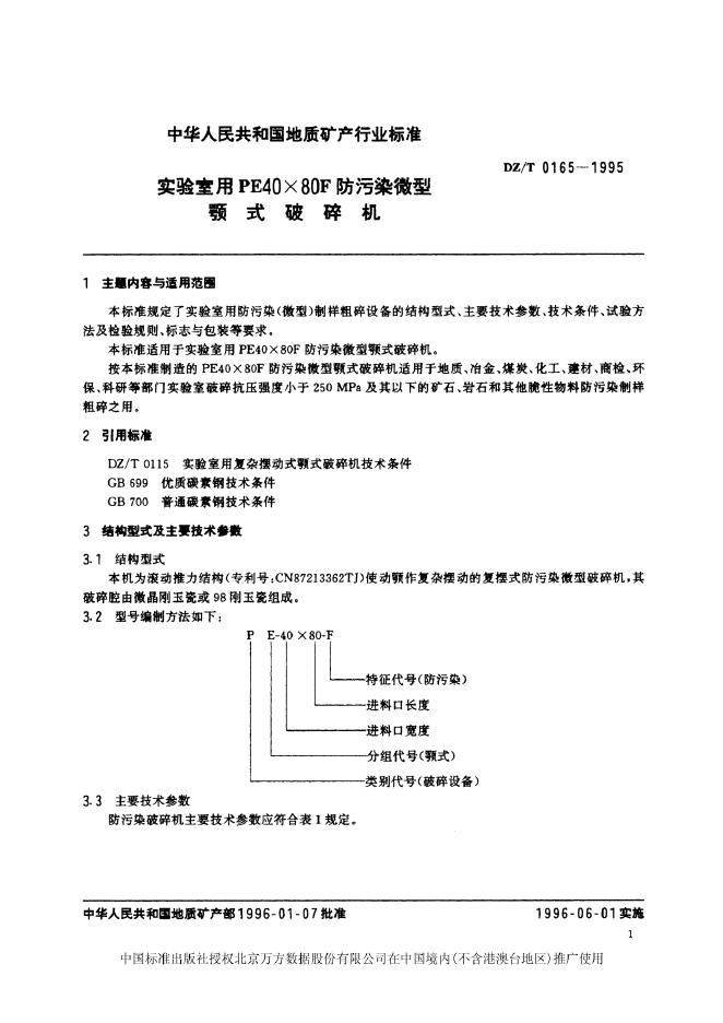 DZ/T 165-1995 实验室用PE40×80F防污染微型颚式破碎机