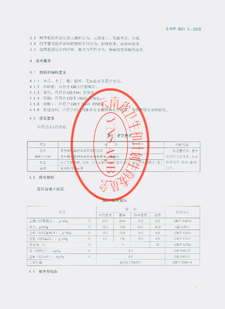 Q/DYF 0001S-2015 大理云风食品有限公司 蜜饯