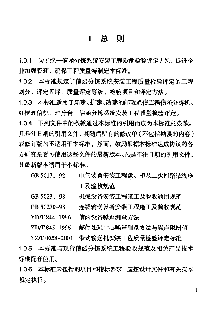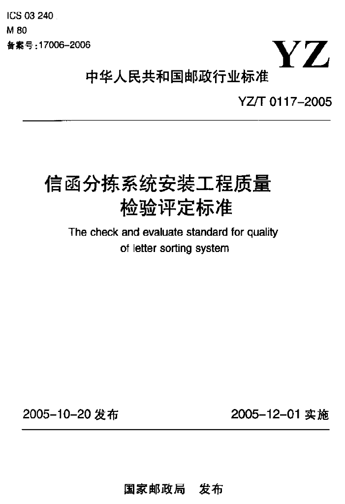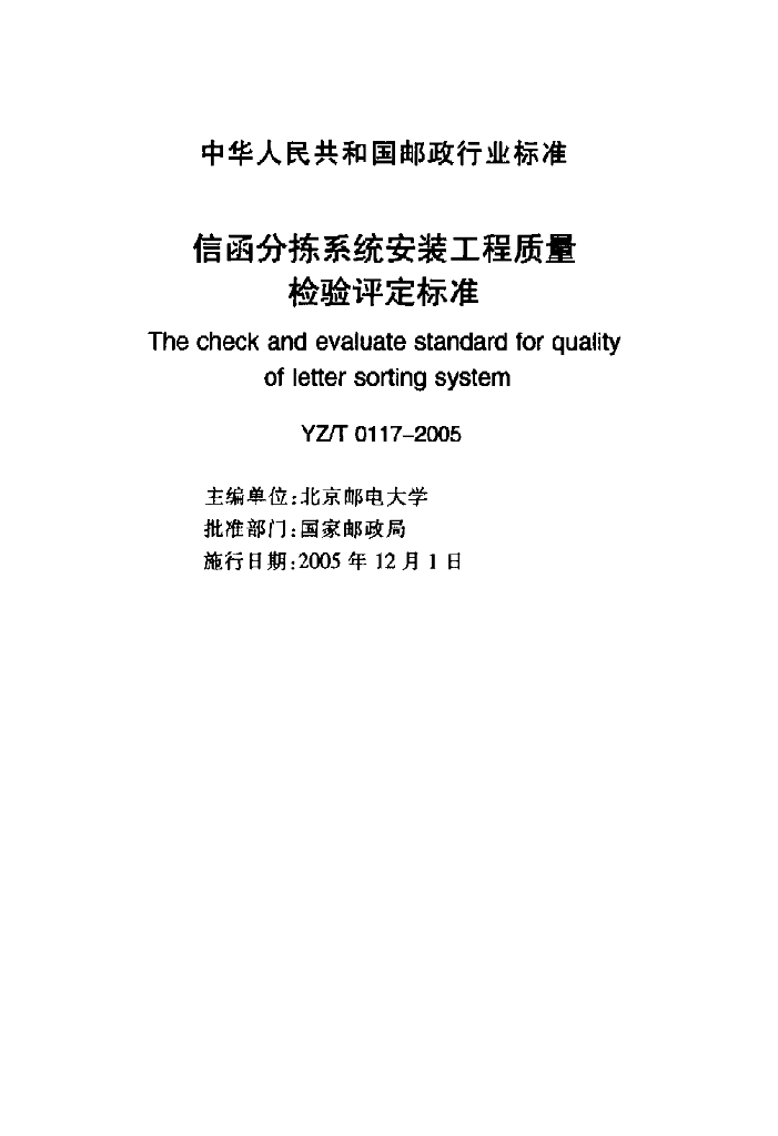 YZ/T 0117-2005 信函分拣系统安装工程质量检验评定标准