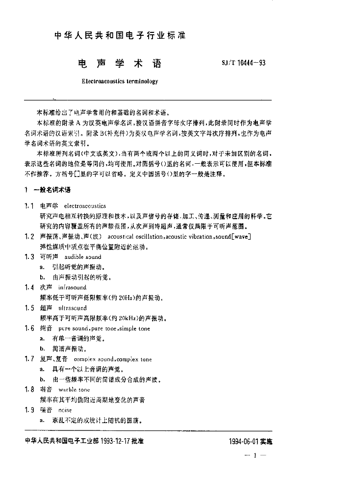 SJ/T 10444-1993 电声学术语