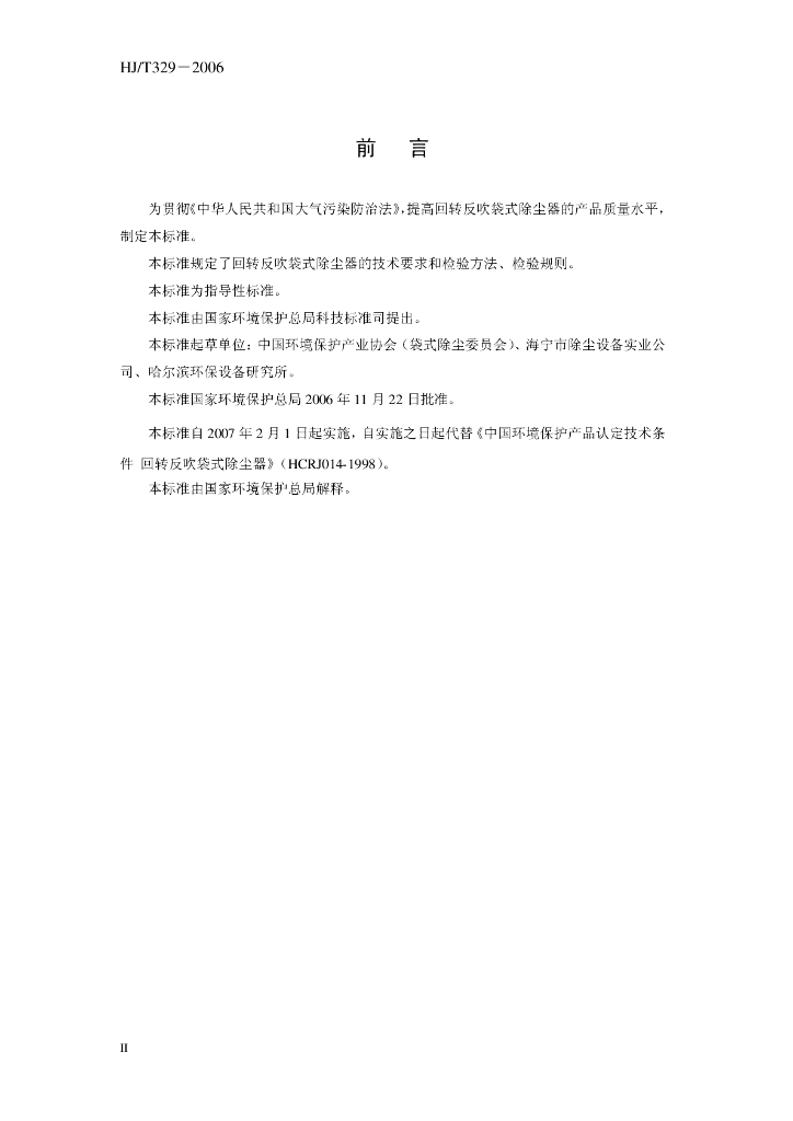 HJ/T 329-2006 环境保护产品技术要求 回转反吹袋式除尘器