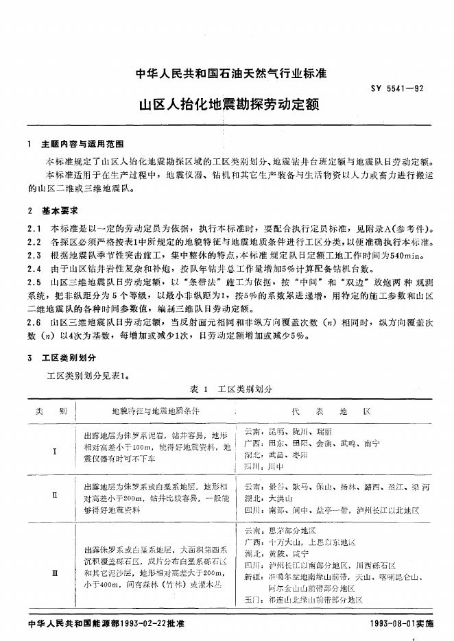 SY 5541-1992 山区人招化地震勘探劳动定额