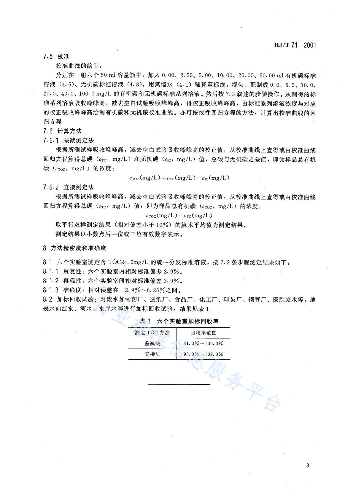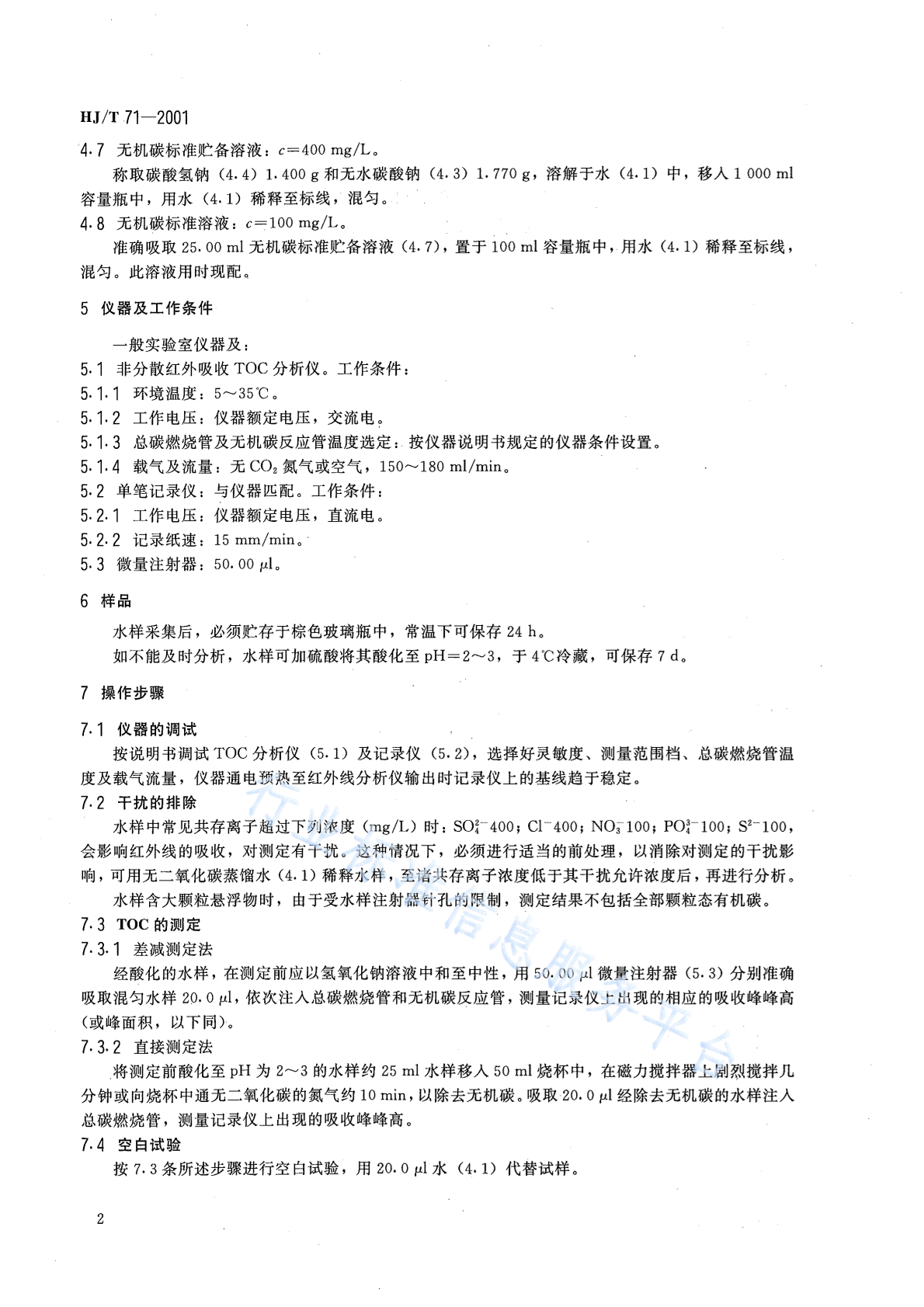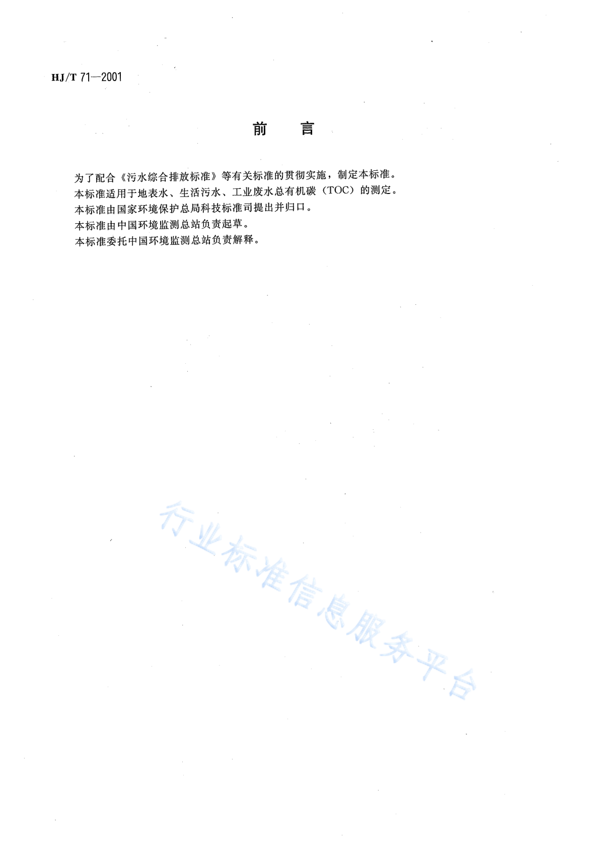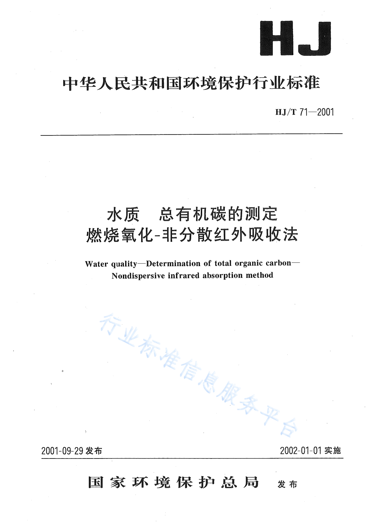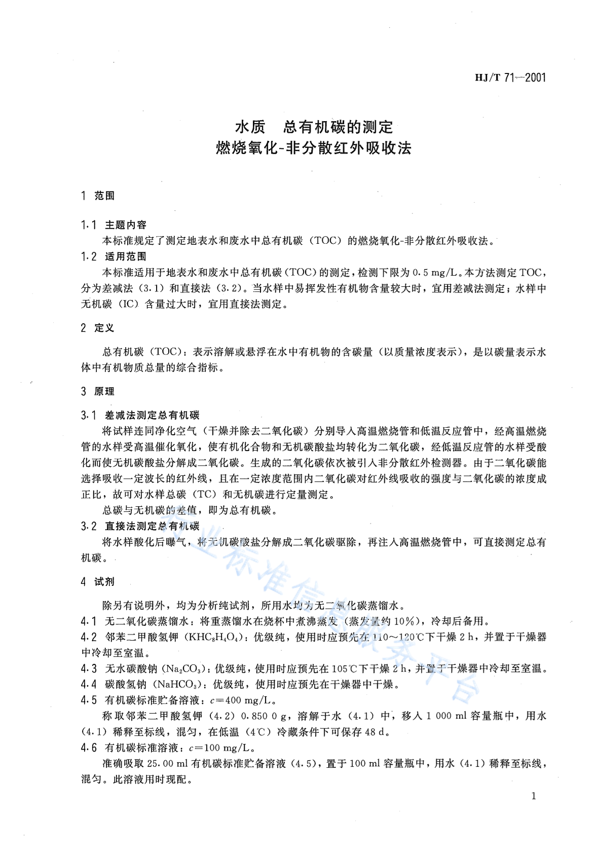 HJ/T 71-2001 水质 总有机碳的测定 燃烧氧化-非分散红外吸收法