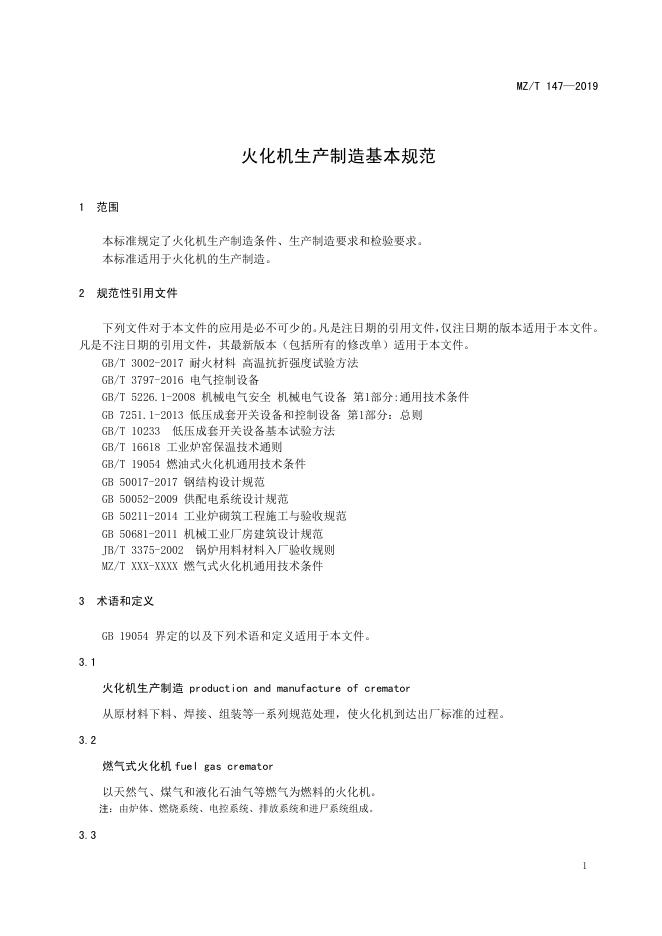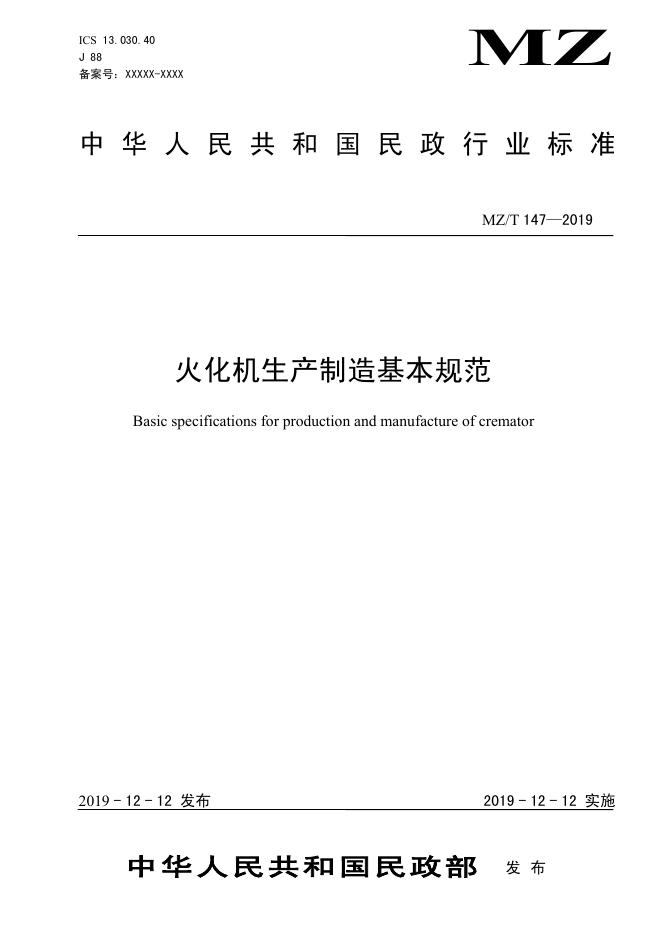 MZ/T 147-2019 火化机生产制造基本规范