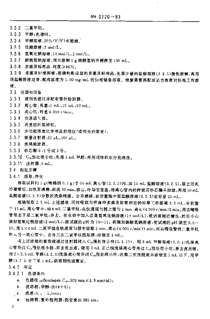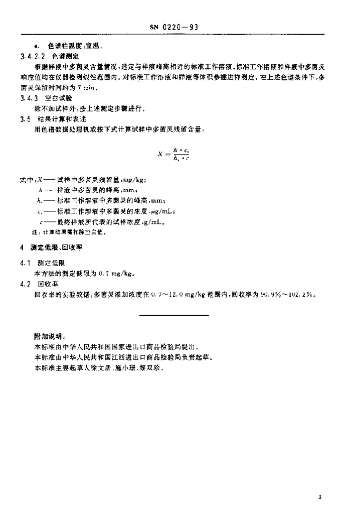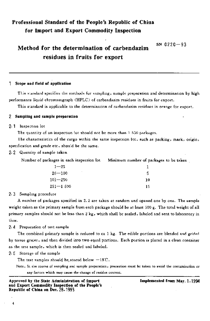 SN 0220-1993 出口水果中多菌灵残留量检验方法