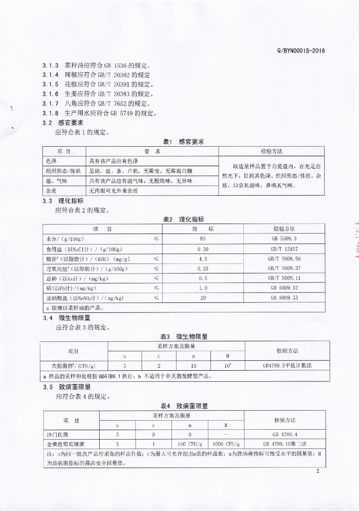 Q/BYN 0001S-2016 巴中永隆食品有限公司 酱腌菜