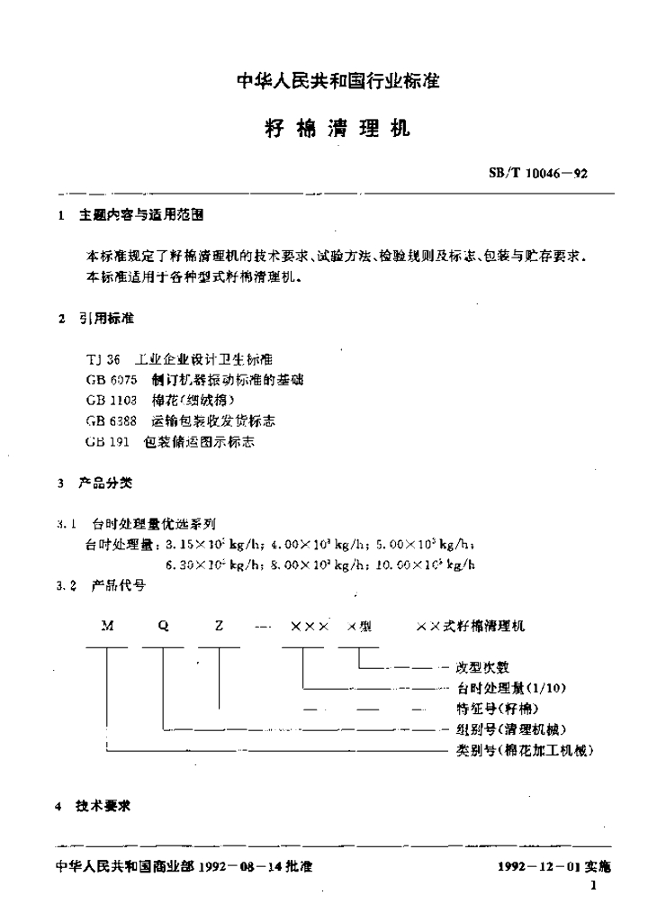 SB/T 10046-1992 籽棉清理机