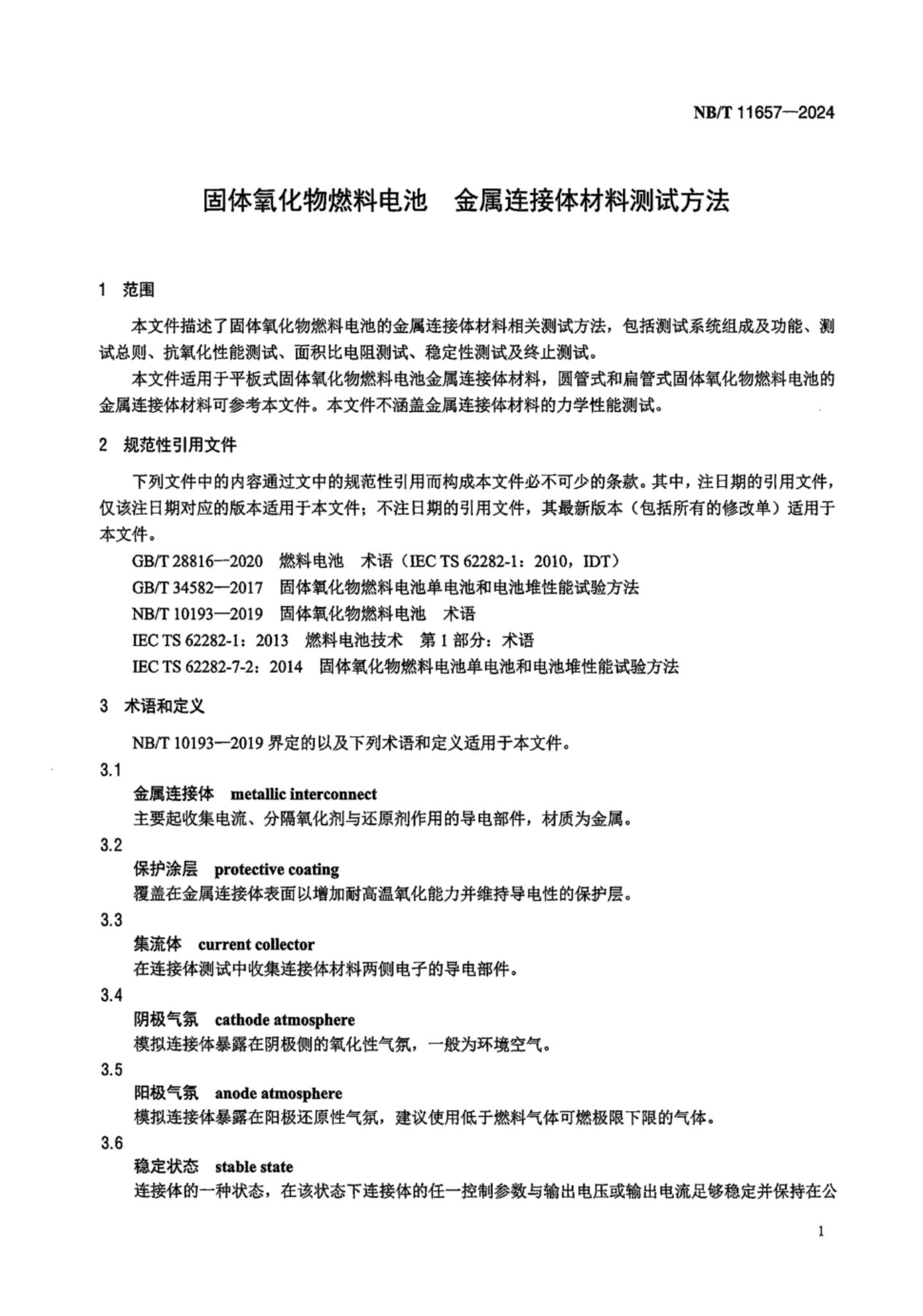NB/T 11657-2024 固体氧化物燃料电池 金属连接体材料测试方法