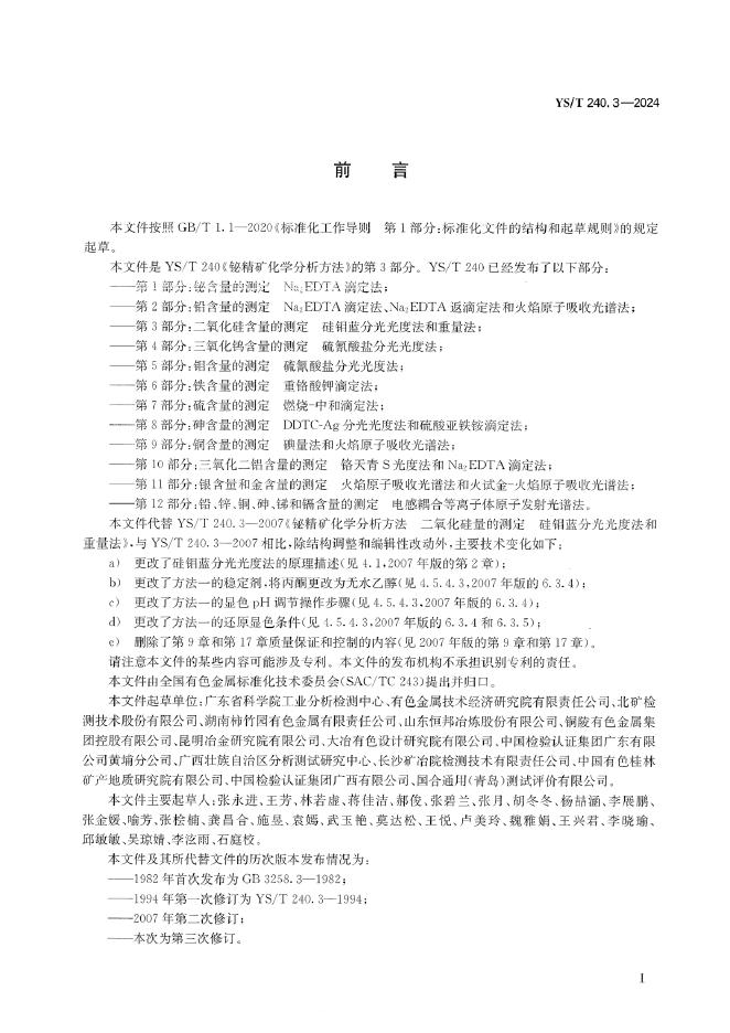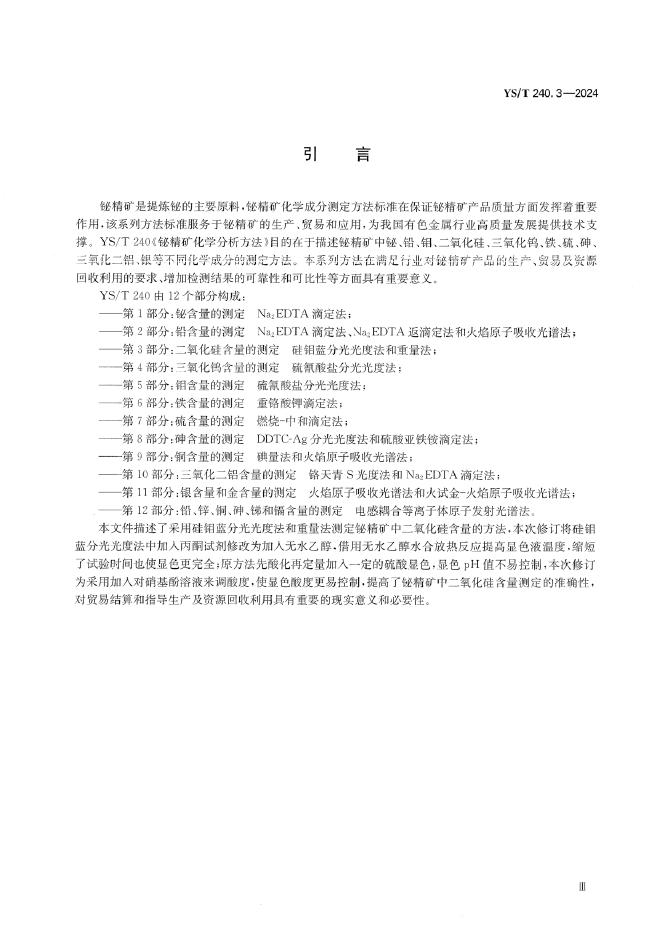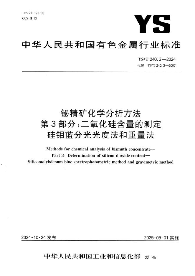 YS/T 240.3-2024 铋精矿化学分析方法 第3部分:二氧化硅含量的测定 硅钼蓝分光光度法和重量法