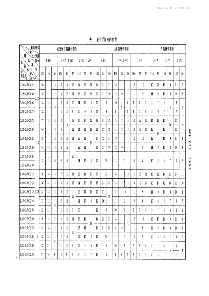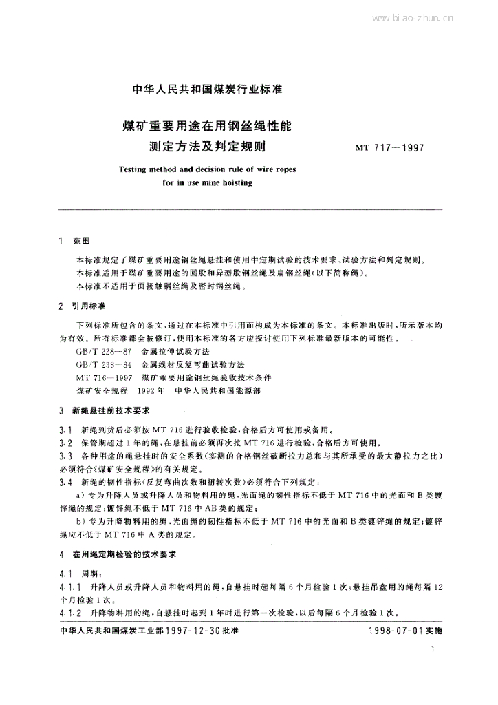 MT 717-1997 煤矿重要用途在用钢丝绳性能测定方法及判定规则