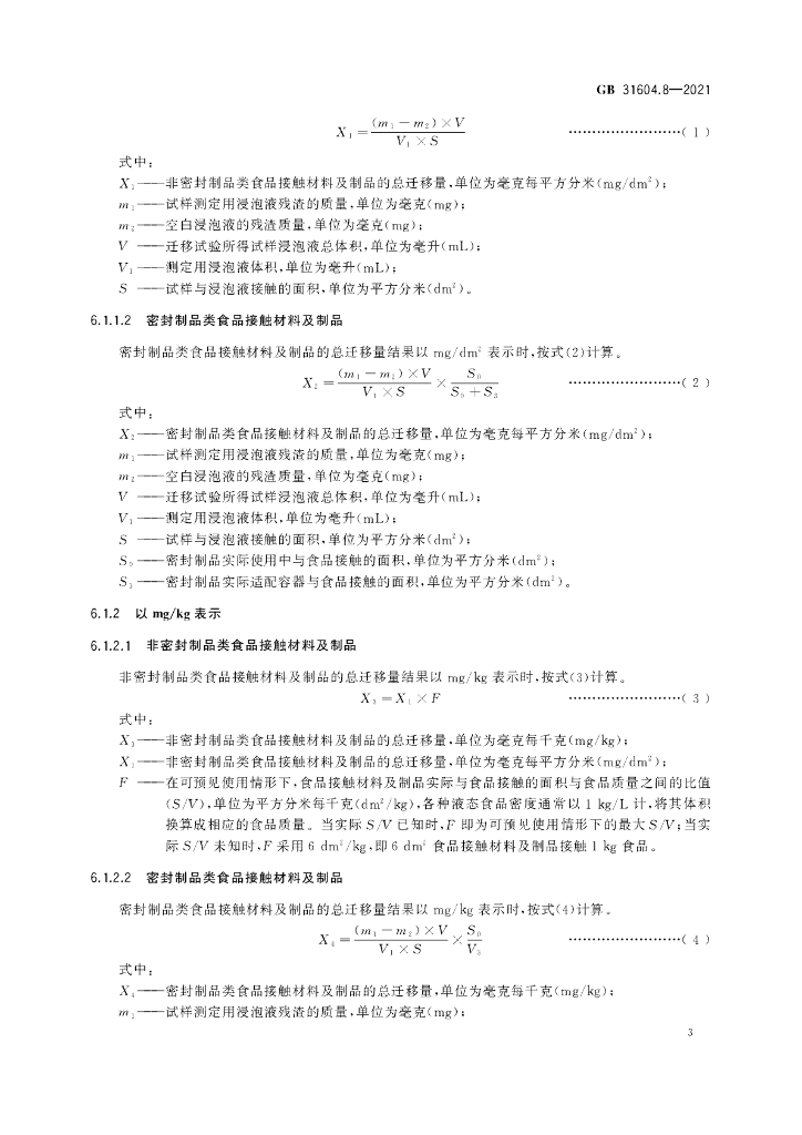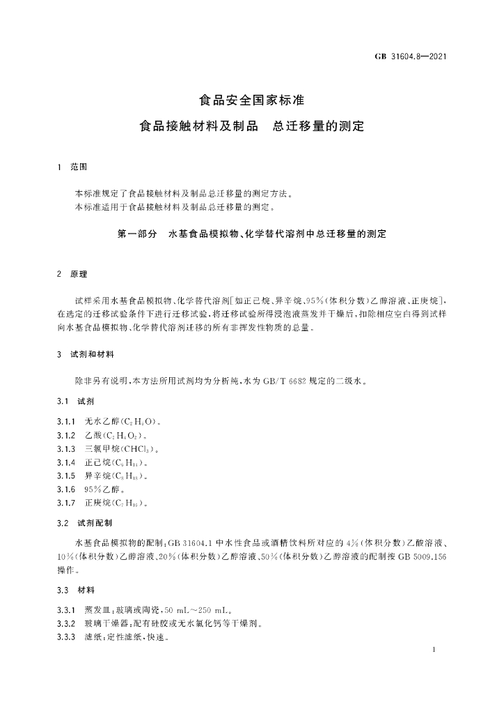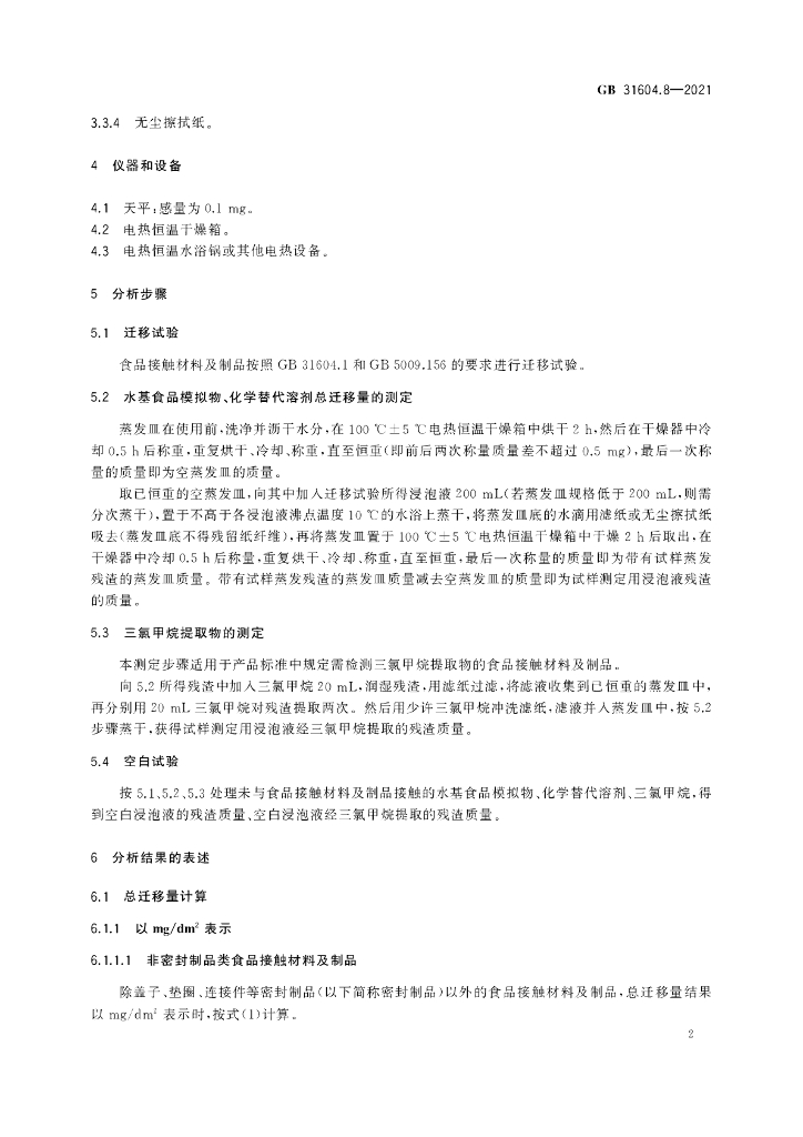 GB 31604.8-2021 食品安全国家标准 食品接触材料及制品总迁移量的测定
