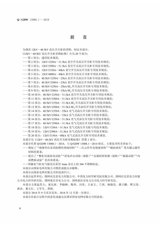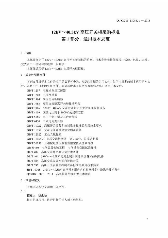 Q/GDW 13088.1-2018 12kV~40.5kV高压开关柜采购标准 第1部分:通用技术规范
