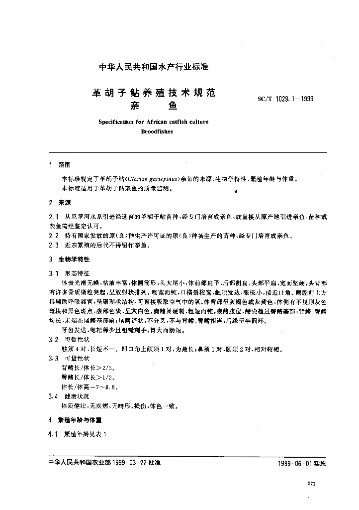 SC/T 1029.1-1999 革胡子鲇养殖技术规范 亲鱼