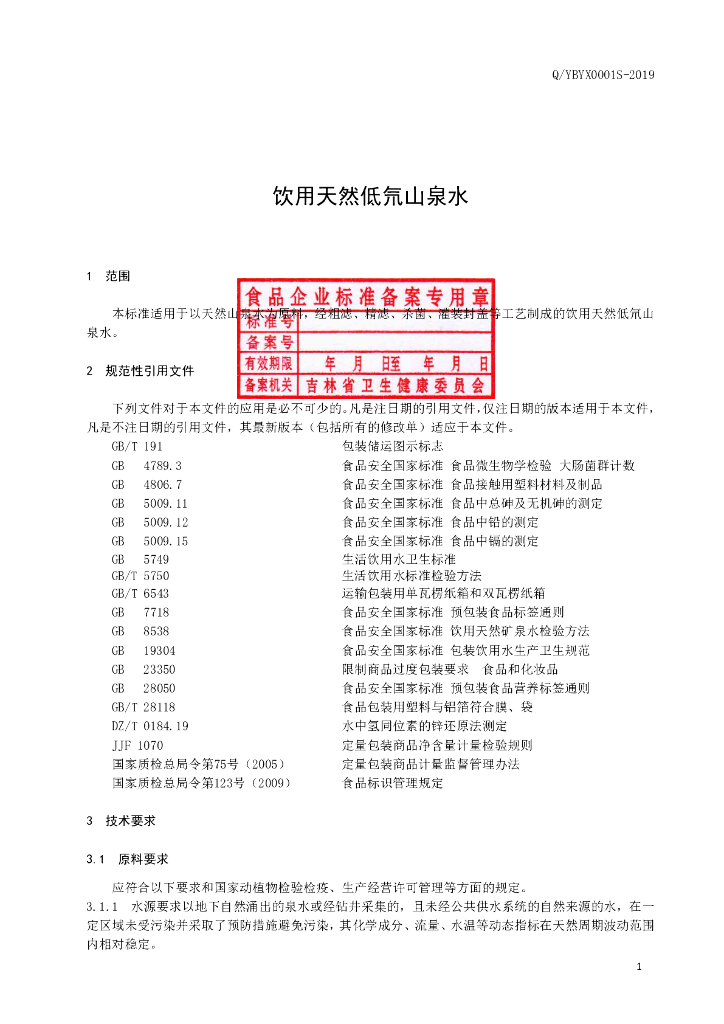 Q/YBYX 0001S-2019 饮用天然低氘山泉水