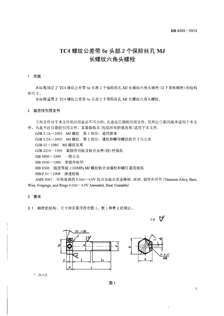 HB 8355-2013 TC4螺纹公差带6e头部2个保险丝孔MJ长螺纹六角头螺栓