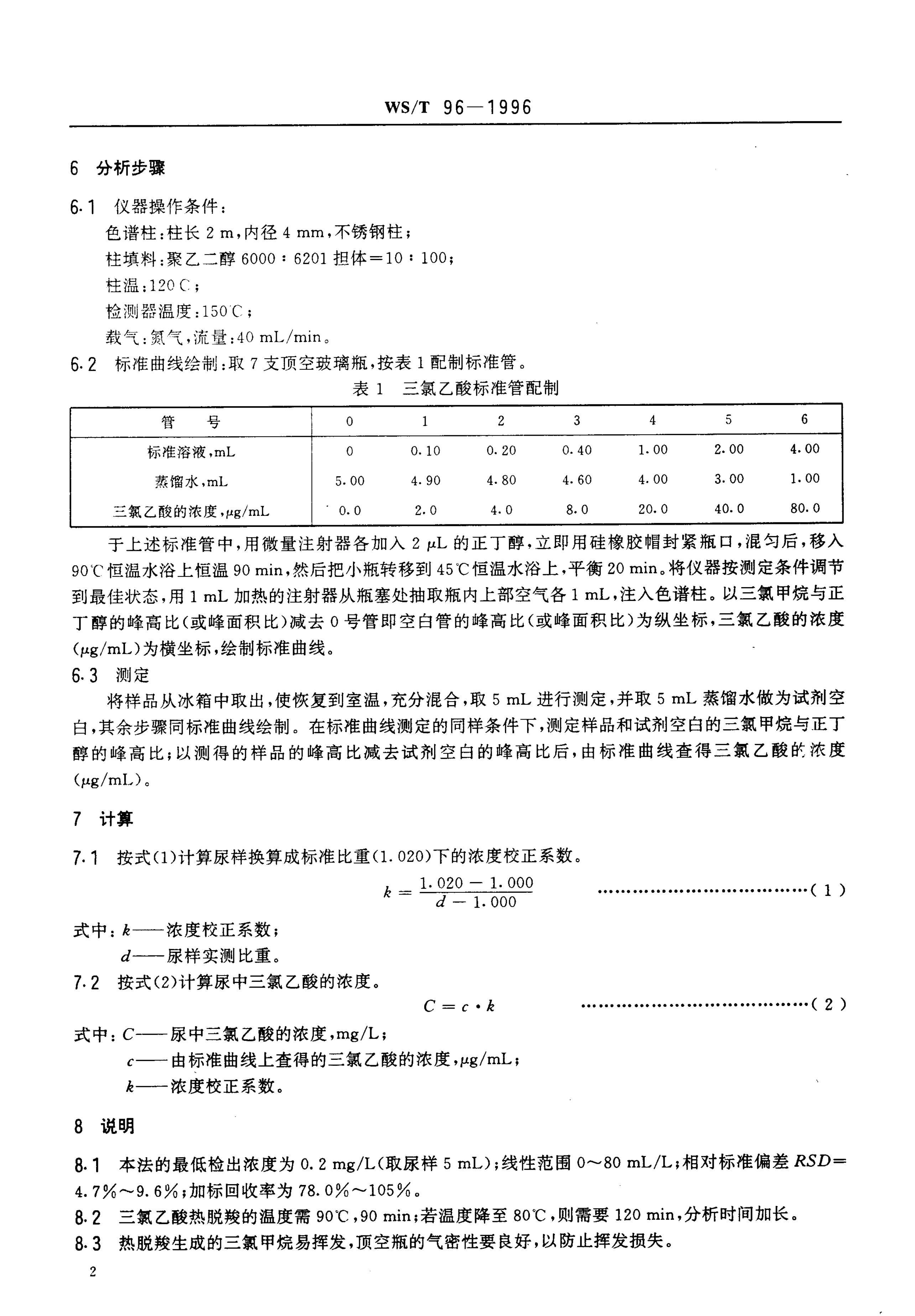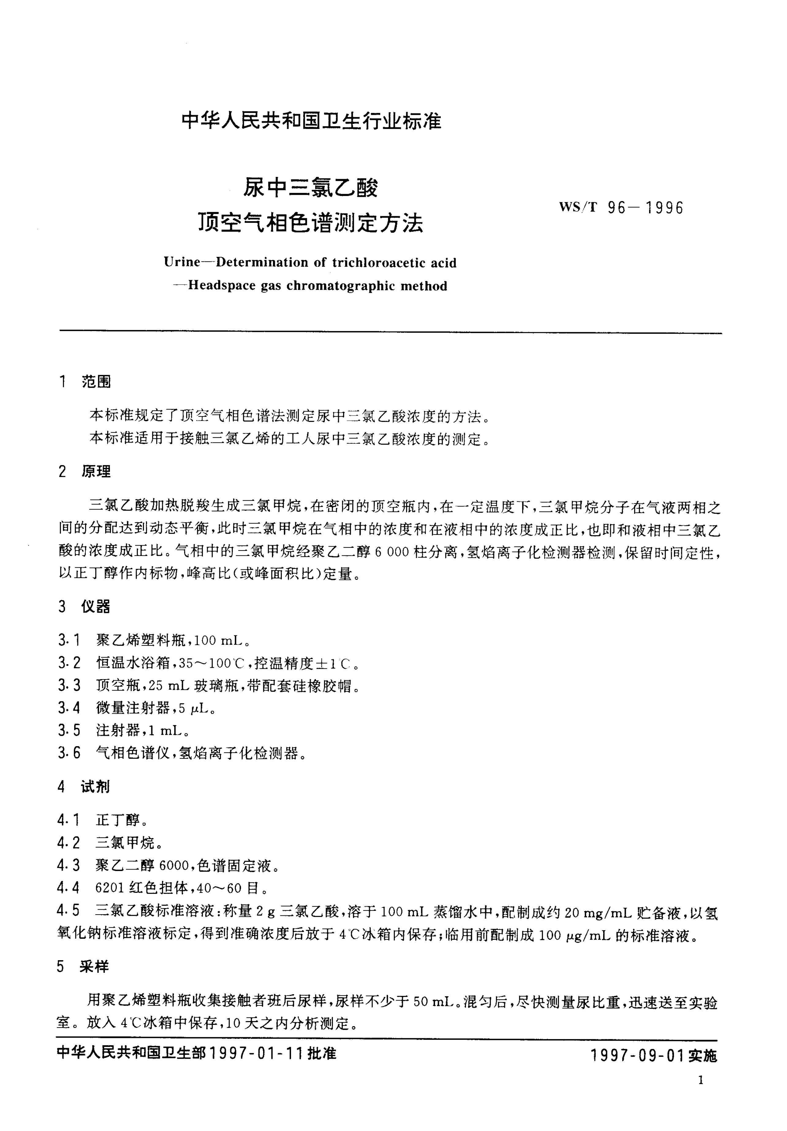 WS/T 96-1996 尿中三氯乙酸顶空气相色谱测定方法