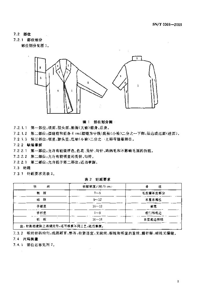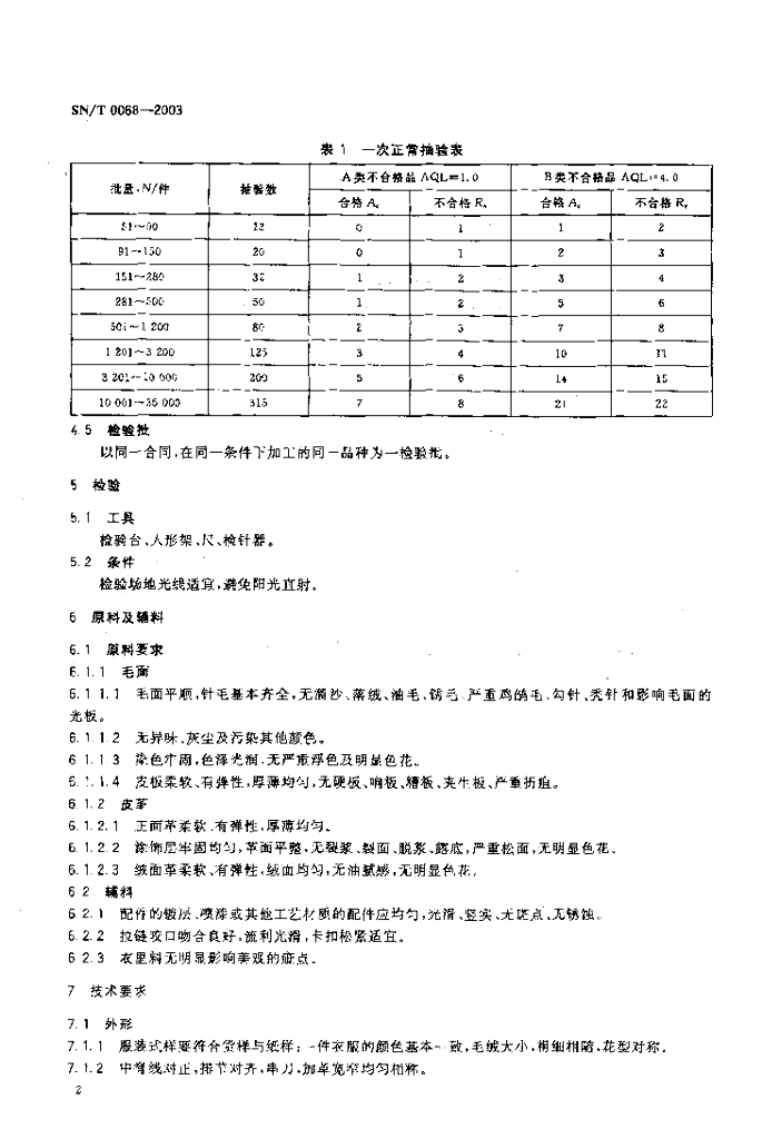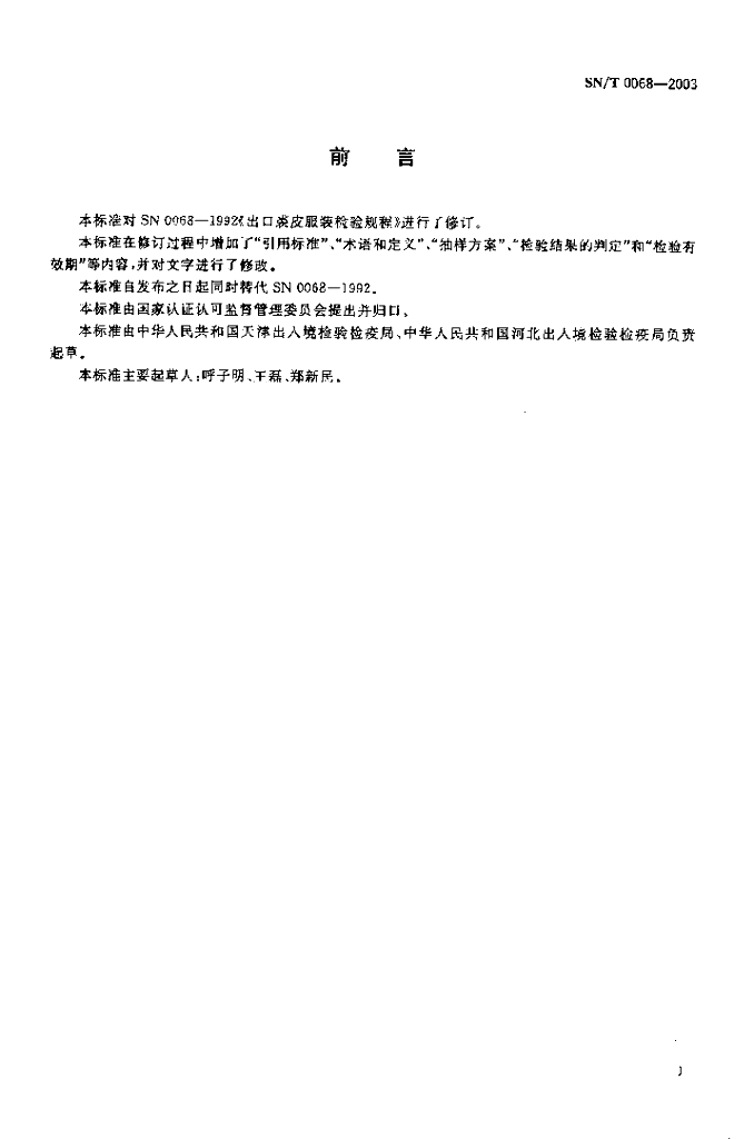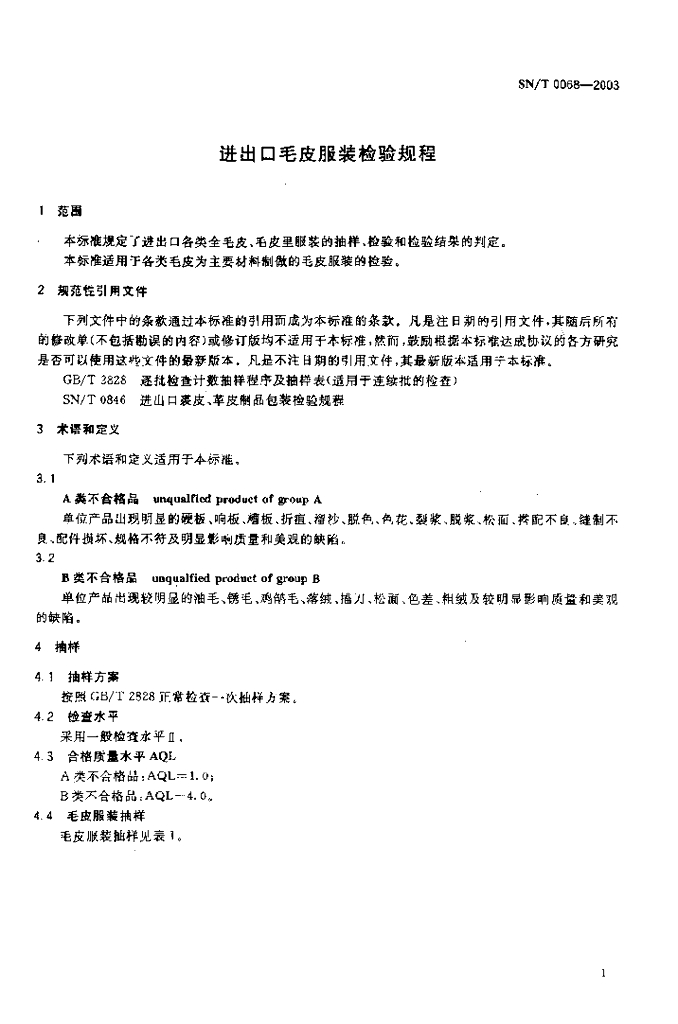 SN/T 0068-2003 进出口毛皮服装检验规程