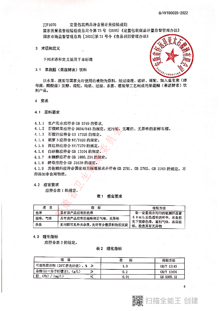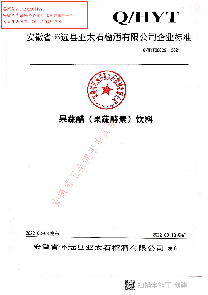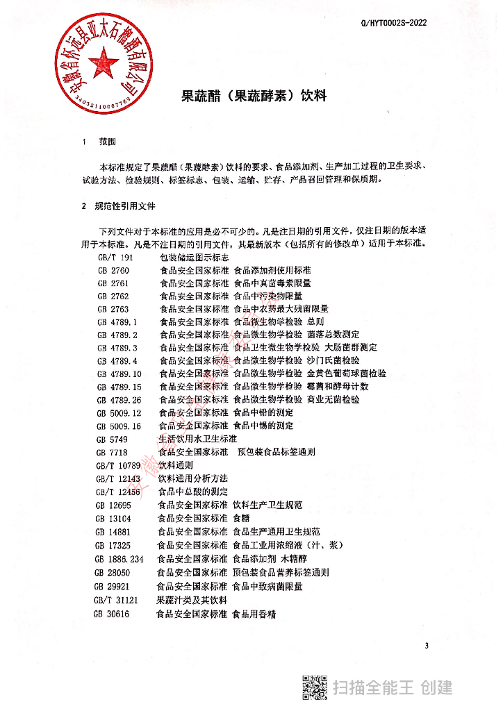 Q/HYT 0002S-2021 果蔬醋(果蔬酵素)饮料