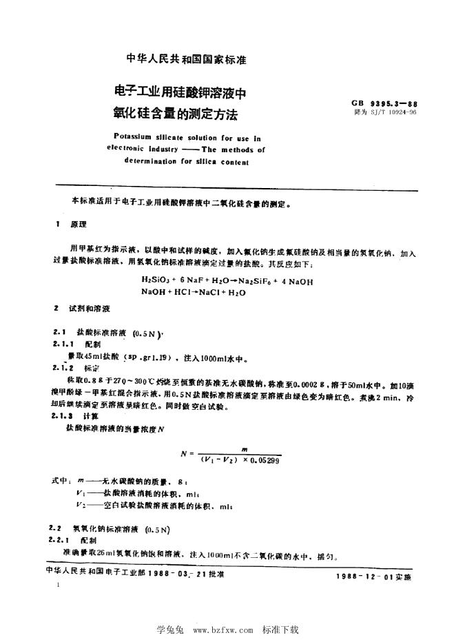 SJ/T 10924-1996 电子工业用硅酸钾溶液中二氧化硅含量的测定方法