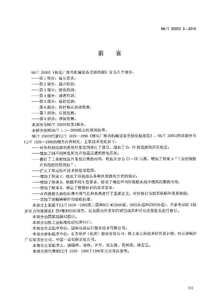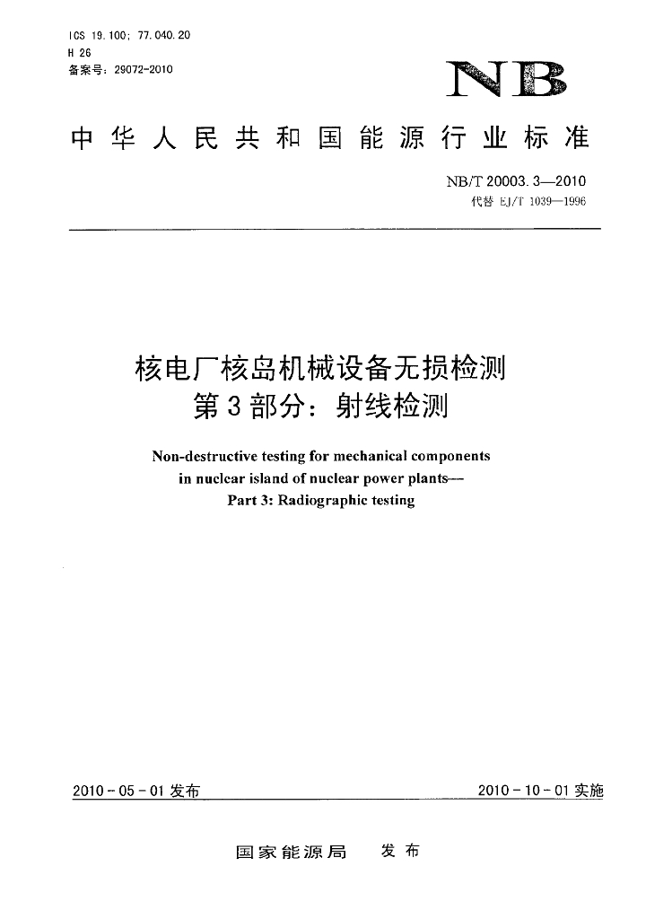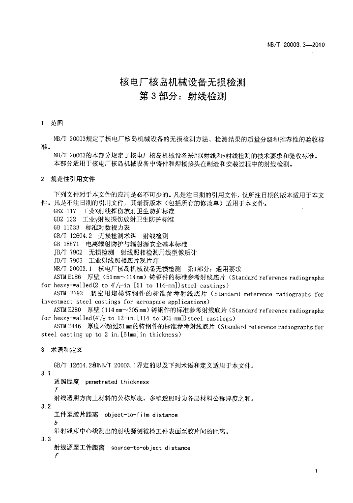 NB/T 20003.3-2010 核电厂核岛机械设备无损检测 第3部分:射线检测