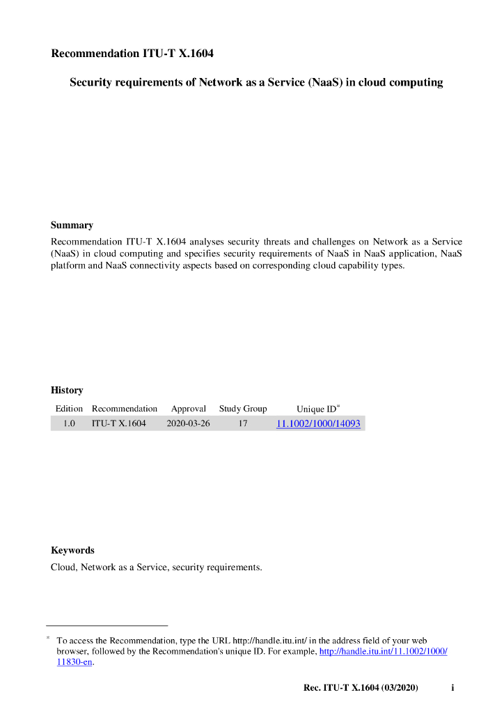 ITU-T X.1604-2020 云计算中网络即服务(NaaS)的安全需求(英文版)