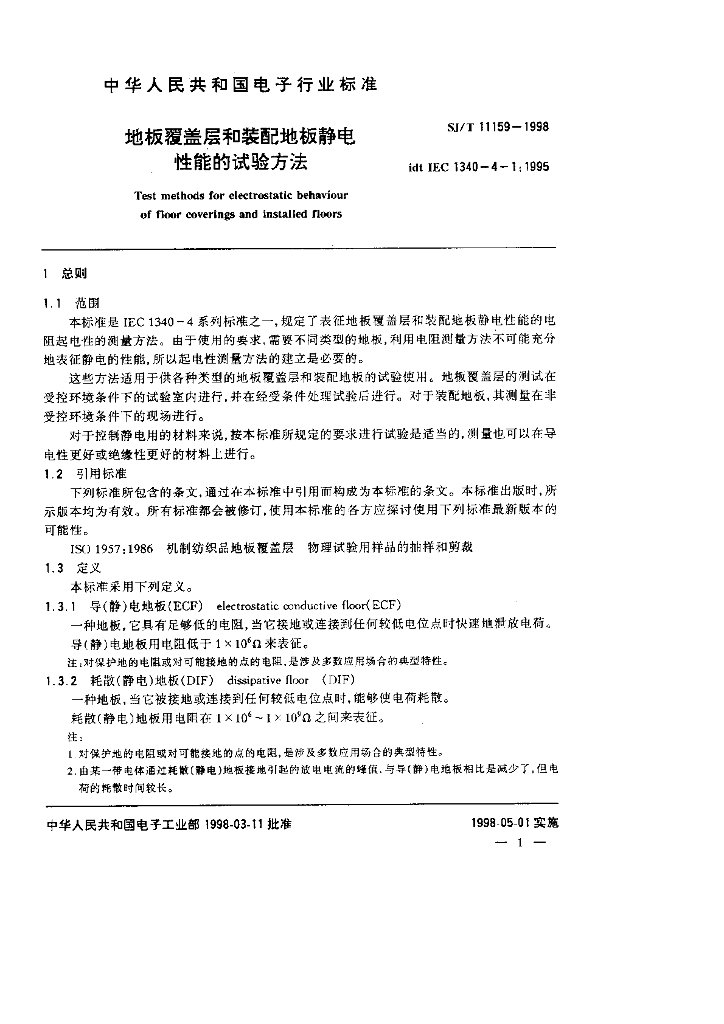 SJ/T 11159-1998 地板覆盖层和装配地板静电性能的试验方法