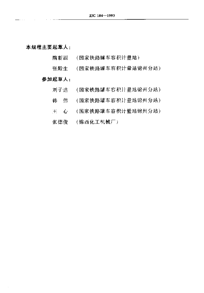 隋新丽(国家铁路罐车容积计量站)、张殿生(国家铁路罐车容积计量站锦州分站)、刘子达(国家铁路罐车容积计量站锦州分站)、韩伟(国家铁路罐车容积计量站锦州分站)、王心(国家铁路罐车容积计量站锦州分站)、张德俊(锦西化工机械厂)